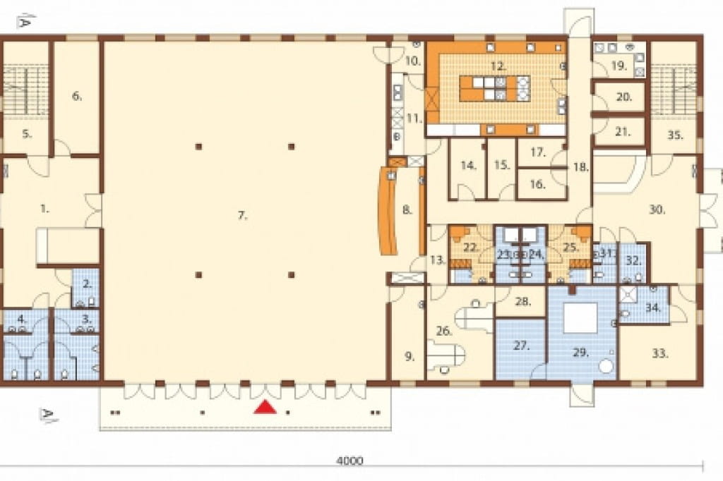 Program: sala bankietowa dla ok. 200 osób, kuchnia z zapleczem, zaplecze sanitarne, zaplecze socjalne, zaplecze biurowe, zaplecze magazynowe, 13 dwuosobowych pokoi noclegowych z łazienkami, 2 apartamenty, pokój dla osoby niepełnosprawnej, 2 sale konferencyjne, kotłownia, skład opału.