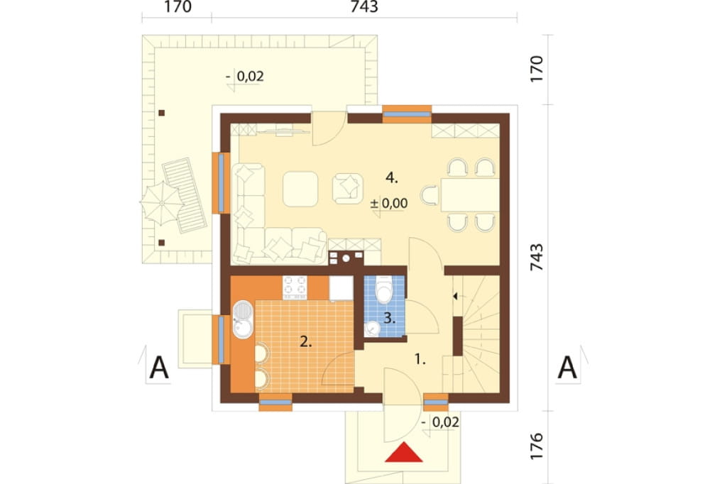 Parter w całości przeznaczony został na strefę dzienną. Zaplanowano tu wygodną kuchnię, pokój dzienny z wyjściem na taras, WC oraz korytarz z klatką schodową.