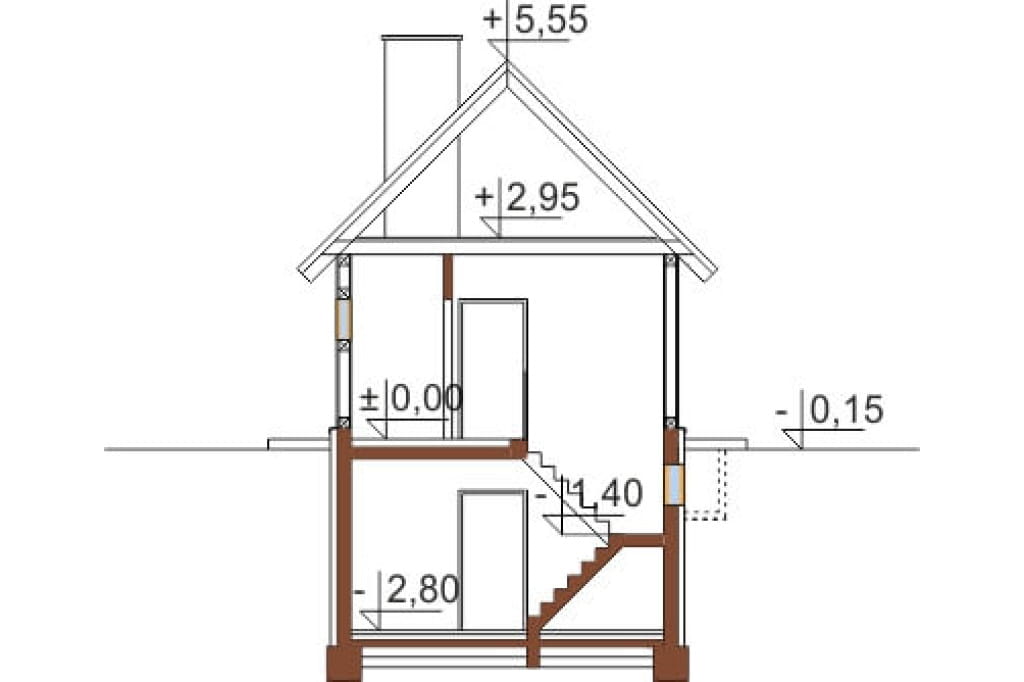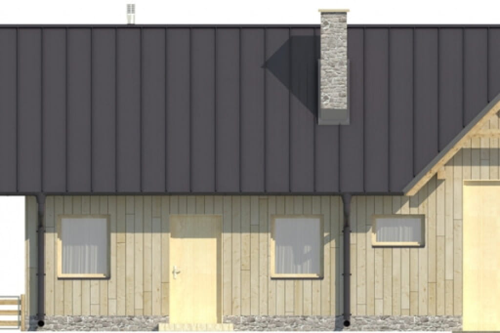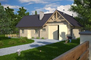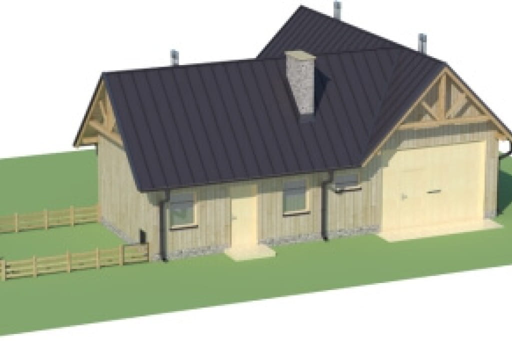 Projekt budynku gospodarczego ZG-62. Budynek parterowy ze strychem częściowym oraz częściowym podpiwniczeniem. Technologia drewniana szkieletowa. Ściany zewnętrzne: słupki drewniane 6x16 i 16x16 cm, pomiędzy słupkami wełna mineralna, od wewnątrz płyty GKF, od zewnątrz panele drewniane. Strop nad piwnicą: żelbetowy, nad parterem: drewniany. Kąt nachylenia dachu 45°.