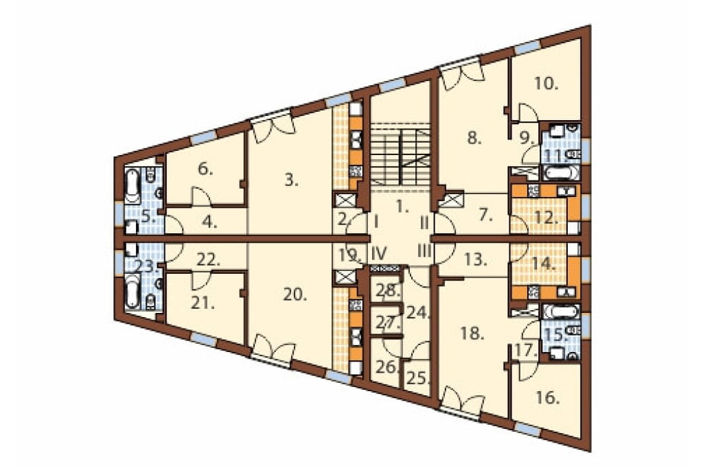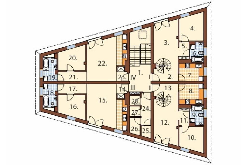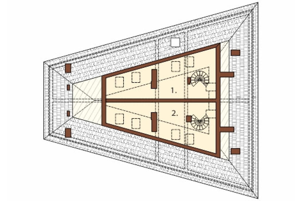 (II poziom mieszkania nr. II z II piętra) Poddasze powiększa powierzchnię użytkową dwóch mieszkań z drugiego piętra. Można tu zaplanować ciekawy w kształcie pokój doświetlony przez cztery świetliki w połaci dachu.