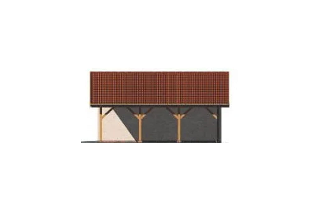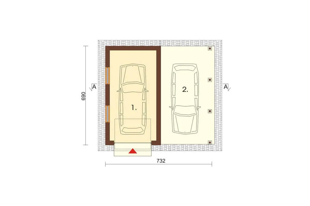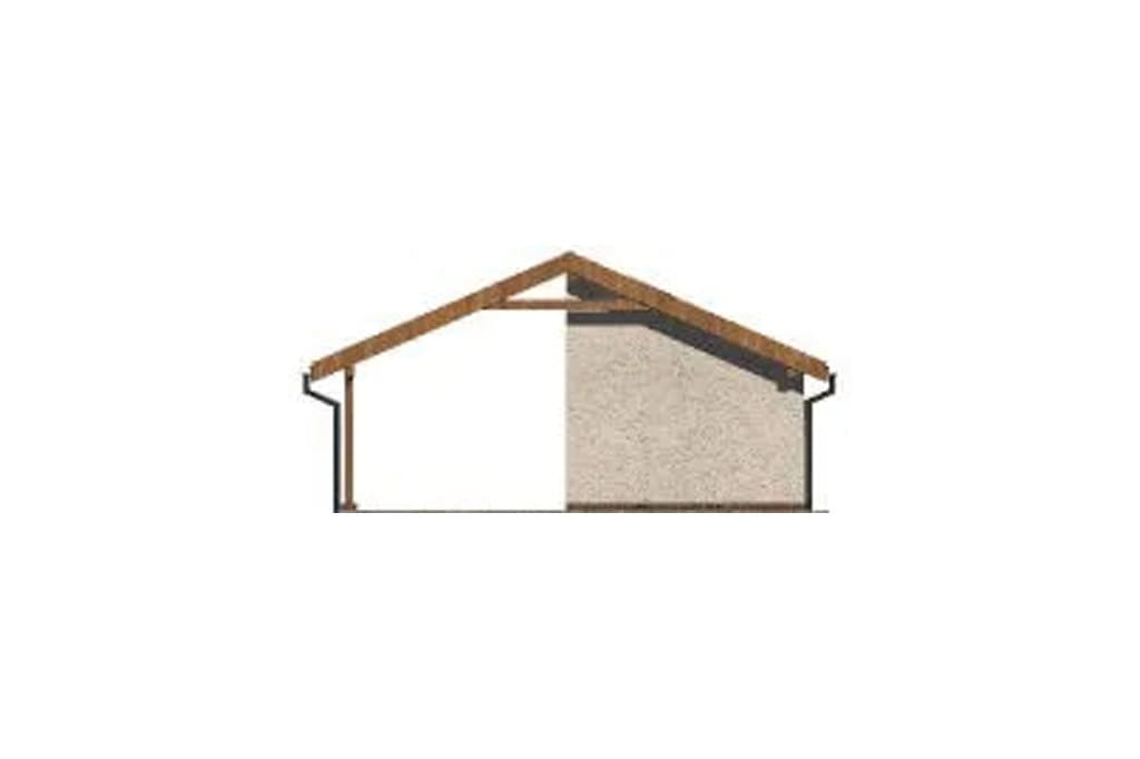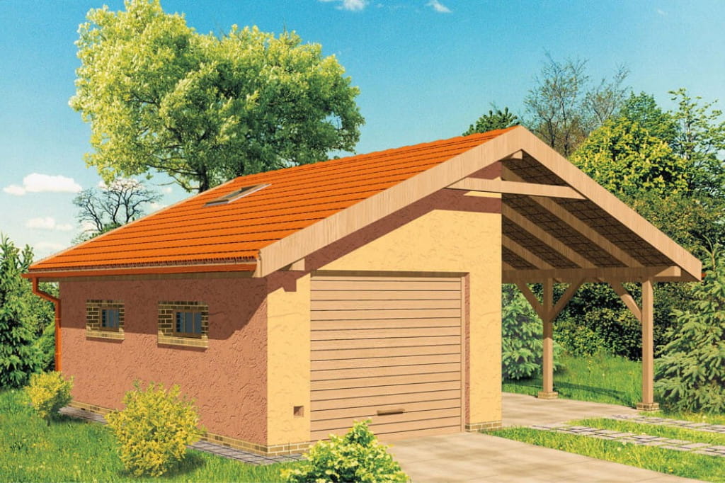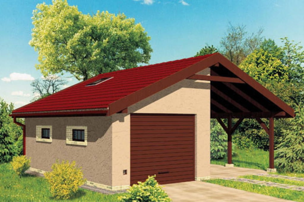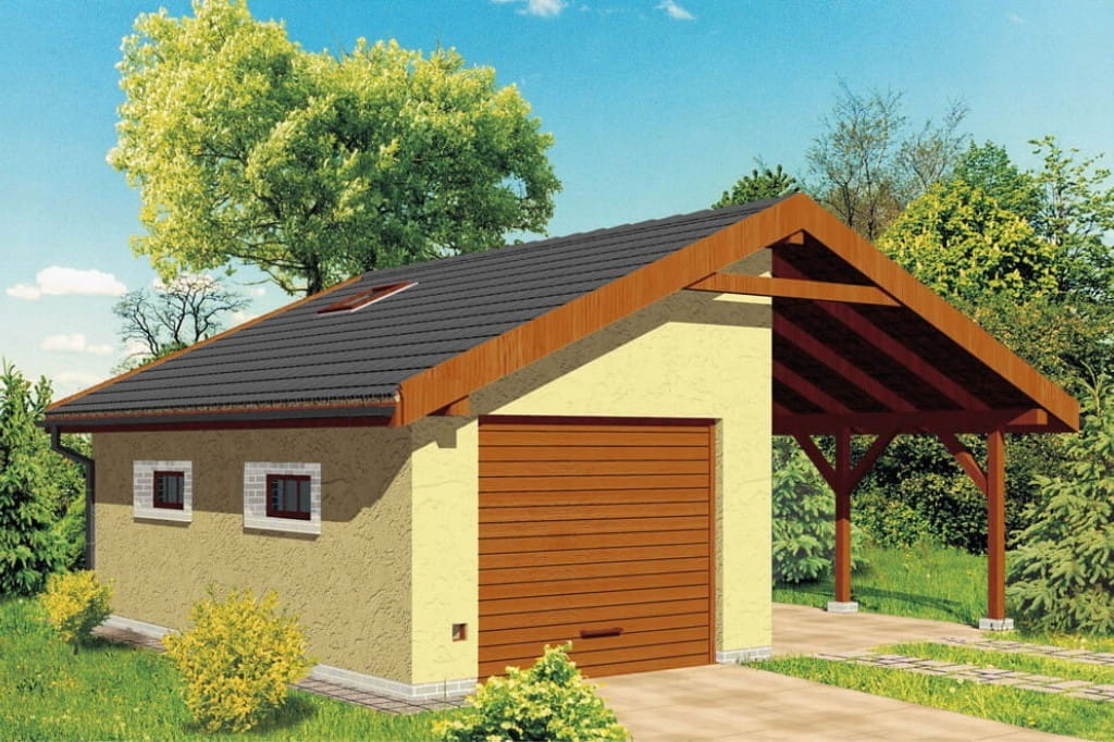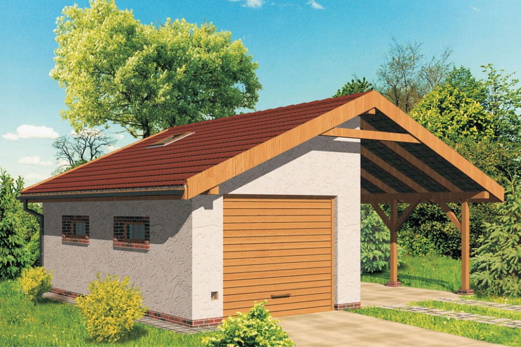 Prosty, a jednocześnie bardzo funkcjonalny projekt budynku gospodarczo-garażowego to propozycja dla osób szukających wolnostojącego garażu z wiatą. Nieskomplikowana konstrukcja składa się z dwuspadowego dachu, pod którym znajdują się dwie części – zabudowany garaż i wsparta na kolumnach wiata. Otwarta część budynku może być przeznaczona na przechowywanie samochodu, dostosować ją można również do otaczającej działki – zaaranżować miejsce na grilla lub wykorzystać jako altanę.
