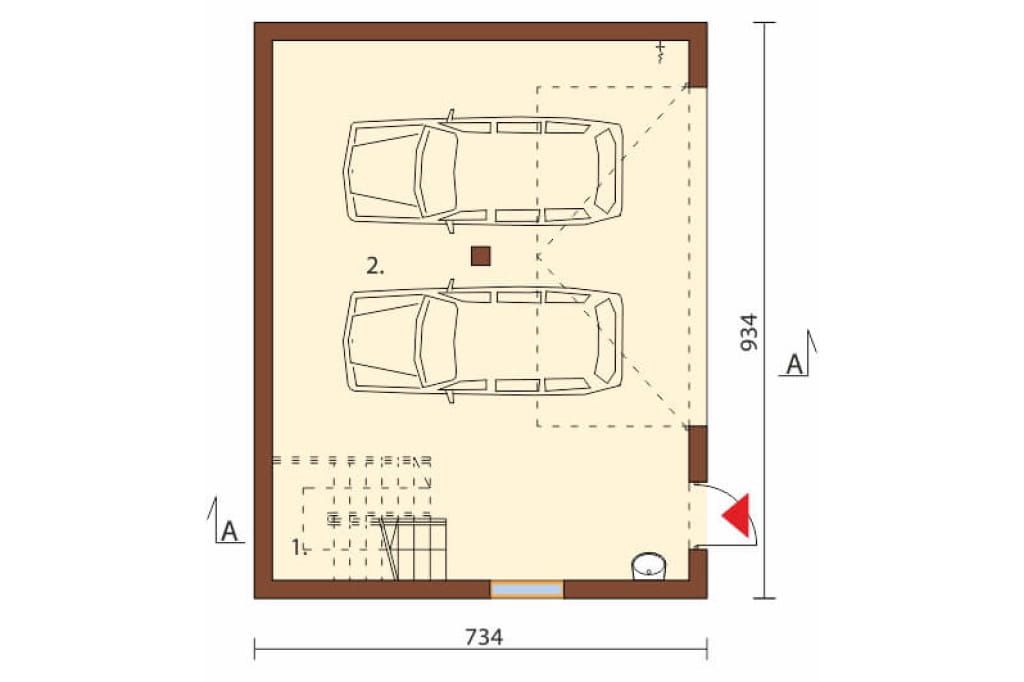 2. Garaż 54,4 m2 Powierzchnia wewnątrz garażu gwarantuje komfortową przestrzeń dla dwóch dużych samochodów. Na wprost wejścia znajdują się schody prowadzące na poddasze.