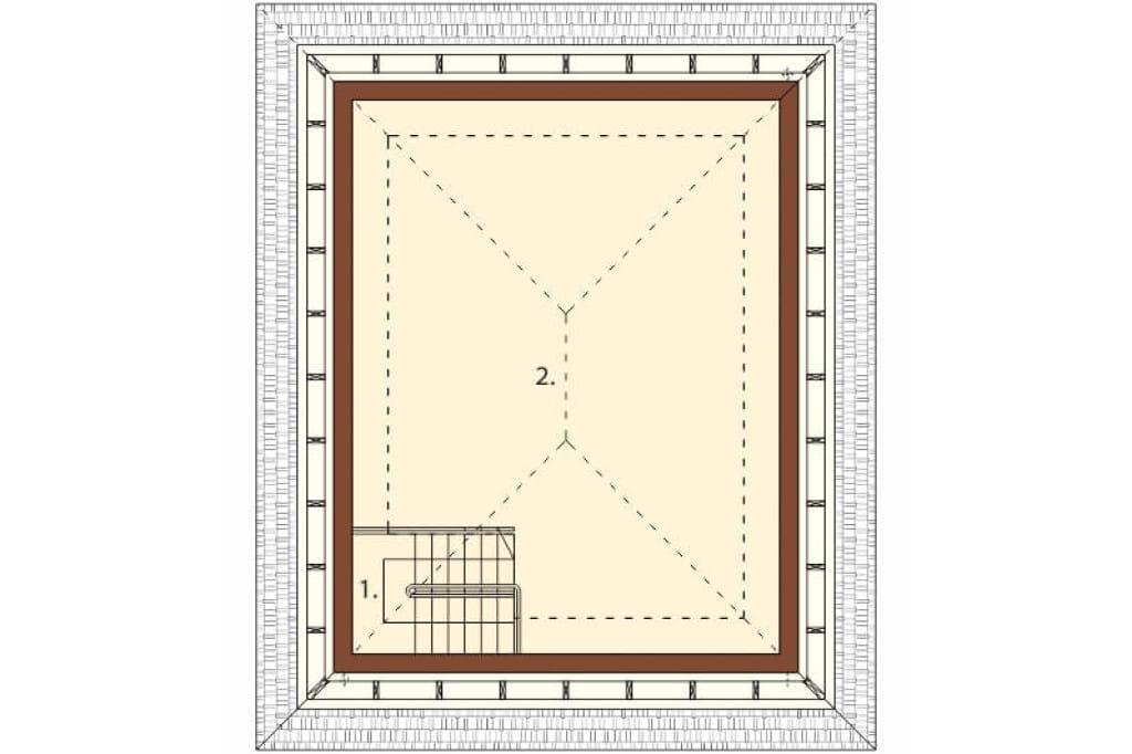 2. Strych 40,1 m2 / 54,4 m2 Przestronny strych można zaadaptować na kilka pomieszczeń służących przechowywaniu sprzętów związanych z majsterkowaniem czy drobnymi naprawami warsztatowymi.