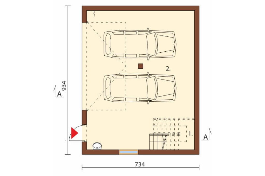 2. Garaż 54,4 m2 Powierzchnia wewnątrz garażu gwarantuje komfortową przestrzeń dla dwóch dużych samochodów. Na wprost wejścia znajdują się schody prowadzące na poddasze.
