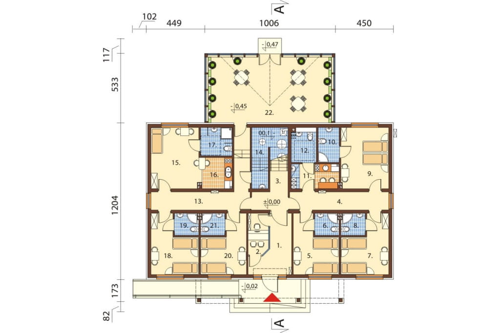Program: 11 pokoi z łazienkami, 2 apartamenty dwupokojowe, 1 apartament jednopokowy, zaplecze socjalne, ogród zimowy.