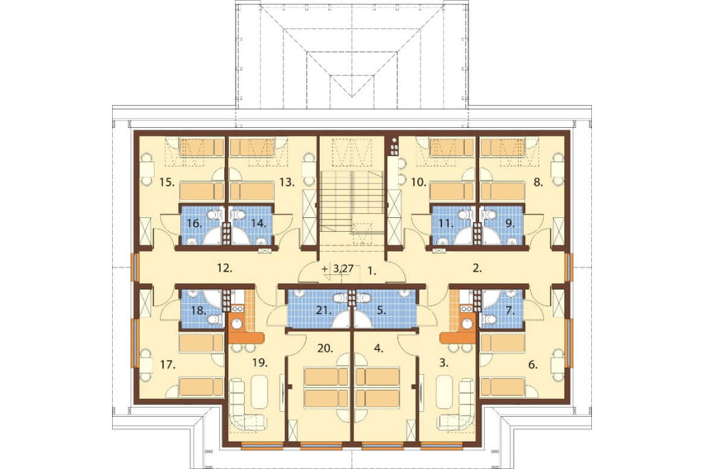 Na poddaszu zaprojektowaliśmy sześć pokoi dwuosobowych oraz dwa apartamenty dwupokojowe. Warto podkreślić, że każdy z pokoi posiada łazienkę, a apartamenty dodatkowo są wyposażone w aneks kuchenny.