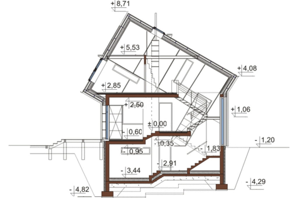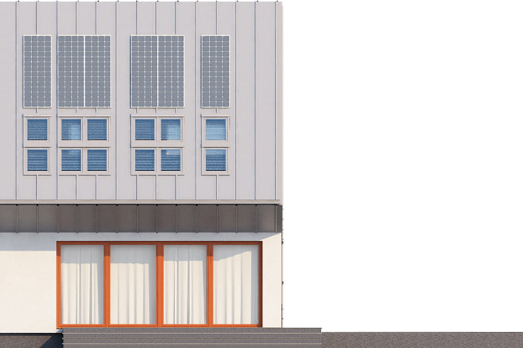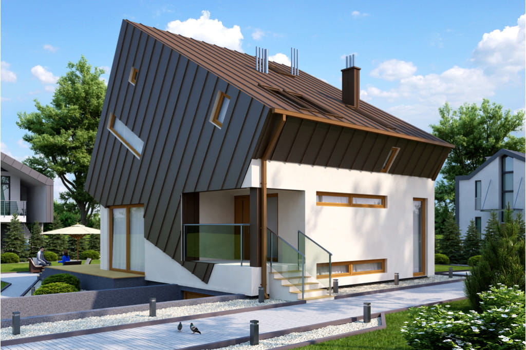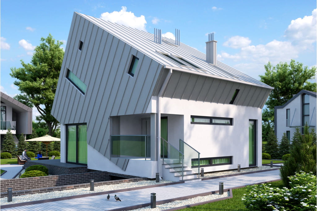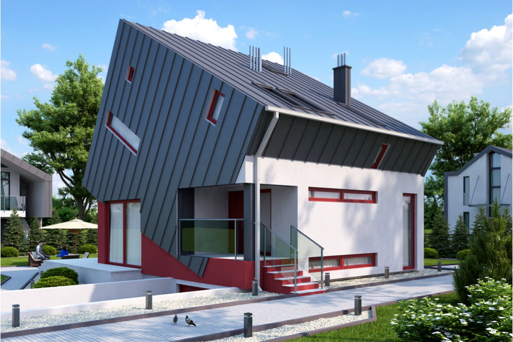 Niezwykle prezentuje się bryła budynku, która sprawia wrażenie jakby składała się z dwóch nałożonych na siebie sześcianów. Osiągnięcie tego rezultatu wymagało od nas zastosowania technologi stalowej. Projekt ma dużą powierzchnię dachu, w którym liczne przeszklenia zapewniają optymalny dopływ światła do wnętrza domu.
