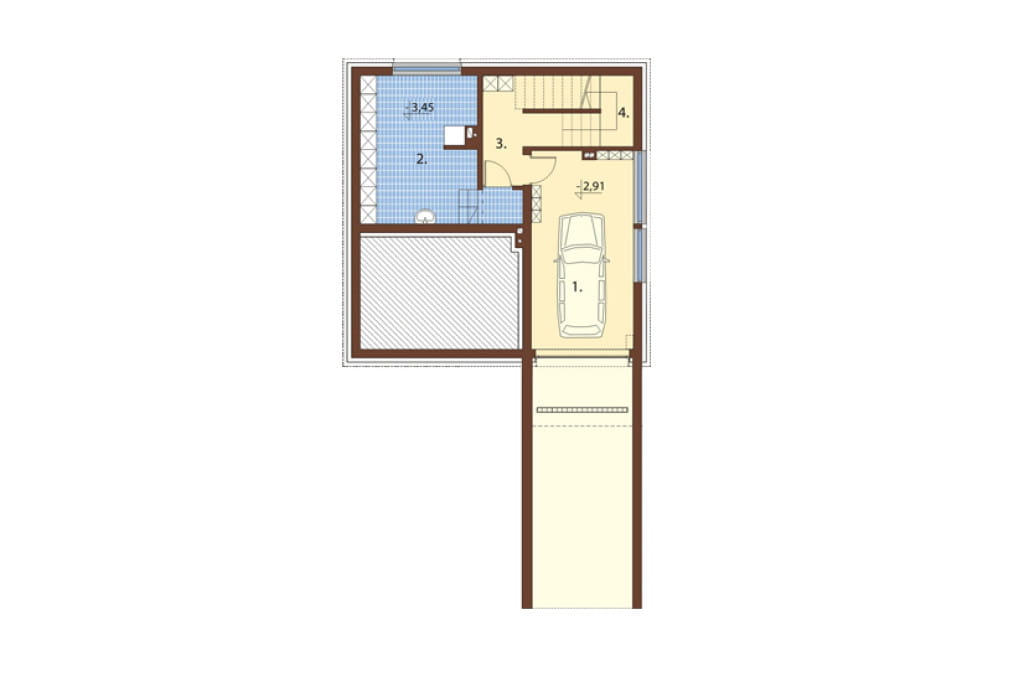W piwnicy nasi architekci zaprojektowali dużą kotłownię, garaż jednostanowiskowy i schody na parter.