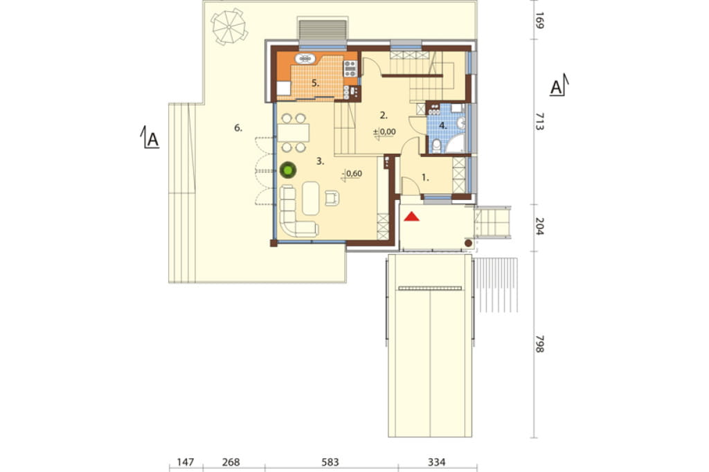 Program: 3 pokoje, salon, kuchnia, 2 łazienki, kotłownia, garaż.