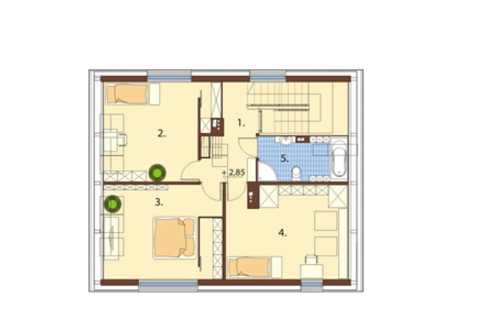 Poddasze zaprojektowaliśmy jako niezwykle wygodną strefę sypialną z trzema pokojami o podobnym metrażu. Domownicy będą mogli skorzystać także z drugiej łazienki znajdującej się obok schodów.