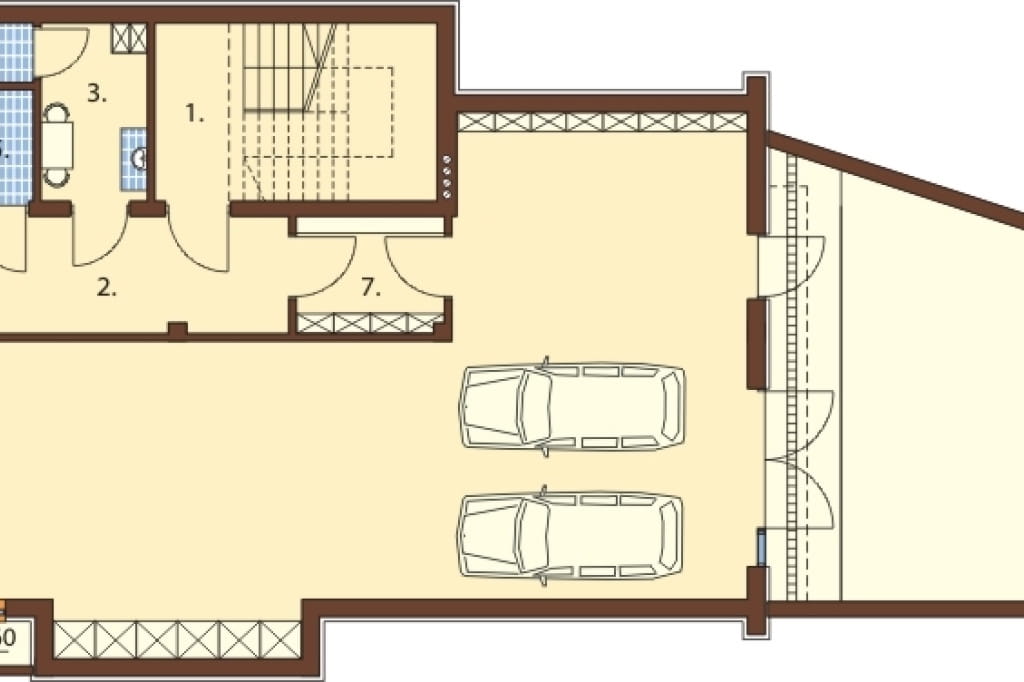 Projekt posiada pełne podpiwniczenie. Zaprojektowaliśmy w nim garaż dwustanowiskow z częścią zapasową oraz zaplecze sklepu, na które składa się: magazyn, pomieszczenie socjalne, WC i kotłownia.
