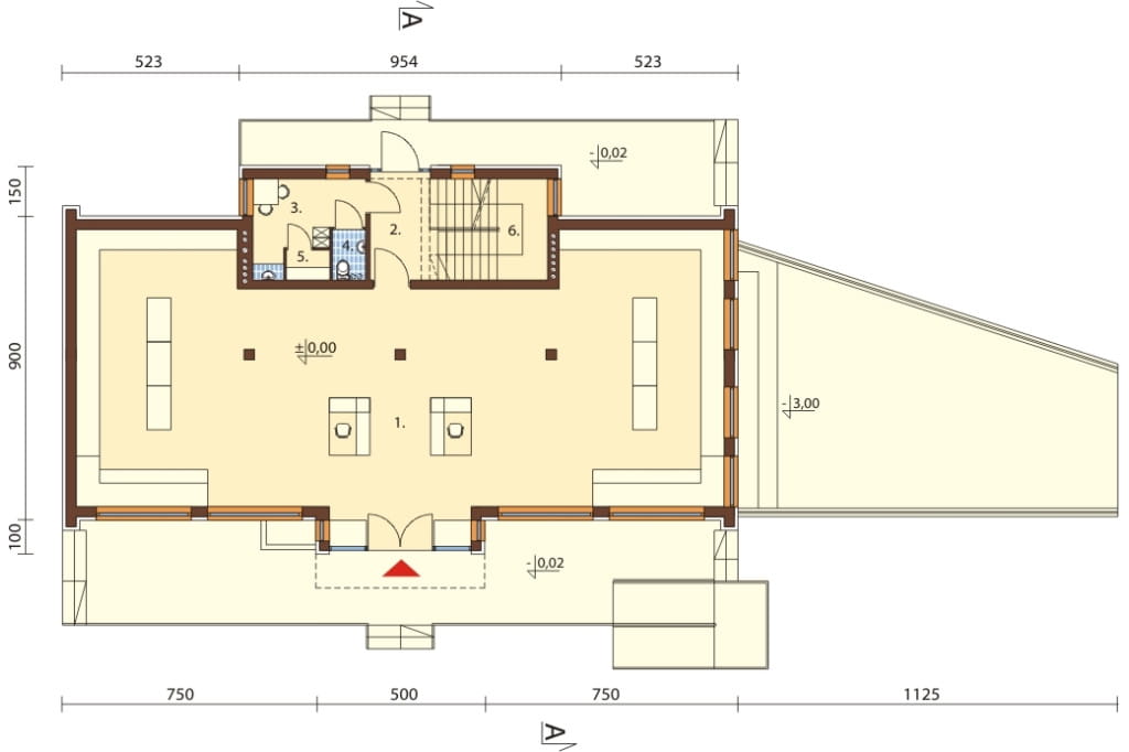 Na parterze jest główna część handlowa z dużą halą sprzedaży o powierzchni 145.42 m2. Dla pracowników zaprojektowaliśmy pomieszczenie socjalne z przebieralnią oraz WC.
