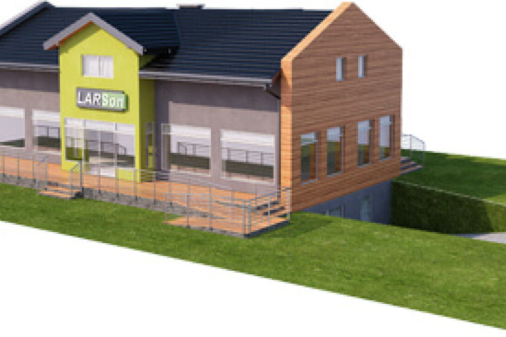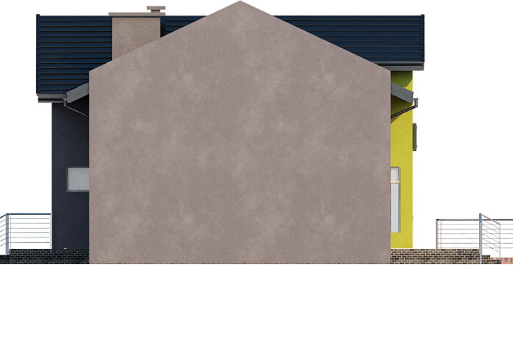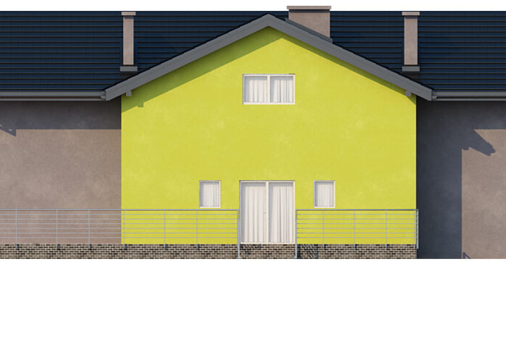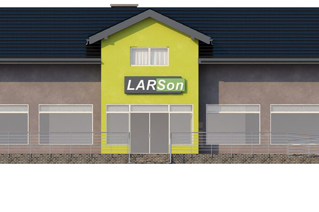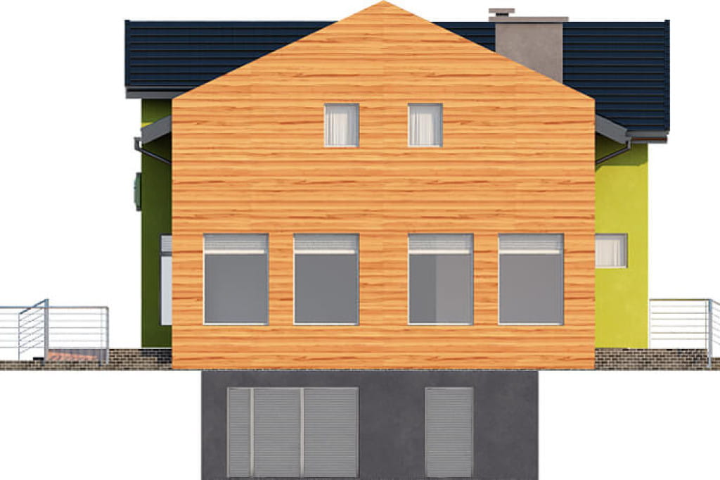 Projekt ma bardzo prostą bryłę na planie prostokąta przykrytą dwuspadowym dachem. W architekturze dominują lekkie wysunięcia w części centralnej, zarówno na elewacji frontowej jak i ogrodowej. W elewacji bocznej zaprojektowaliśmy wjazd do garażu znajdującego się w piwnicy. Doskonałe doświetlenie części sklepowej zapewniają duże przeszklenia na froncie. Wymagana szerokość działki dla tego projektu wynosi 20.40 m.