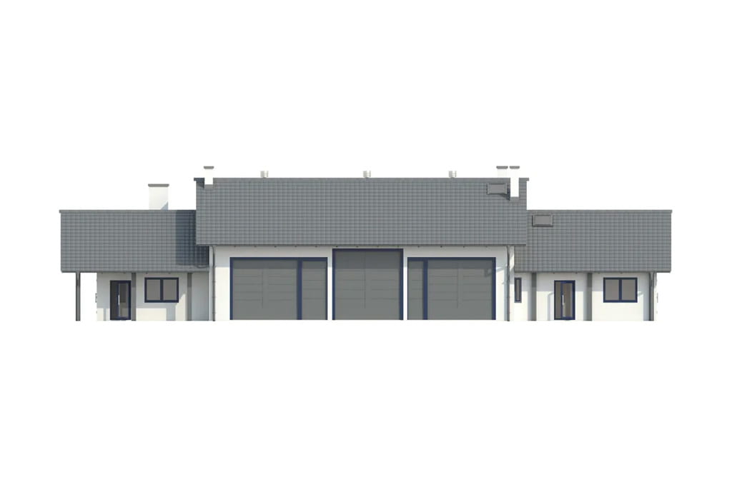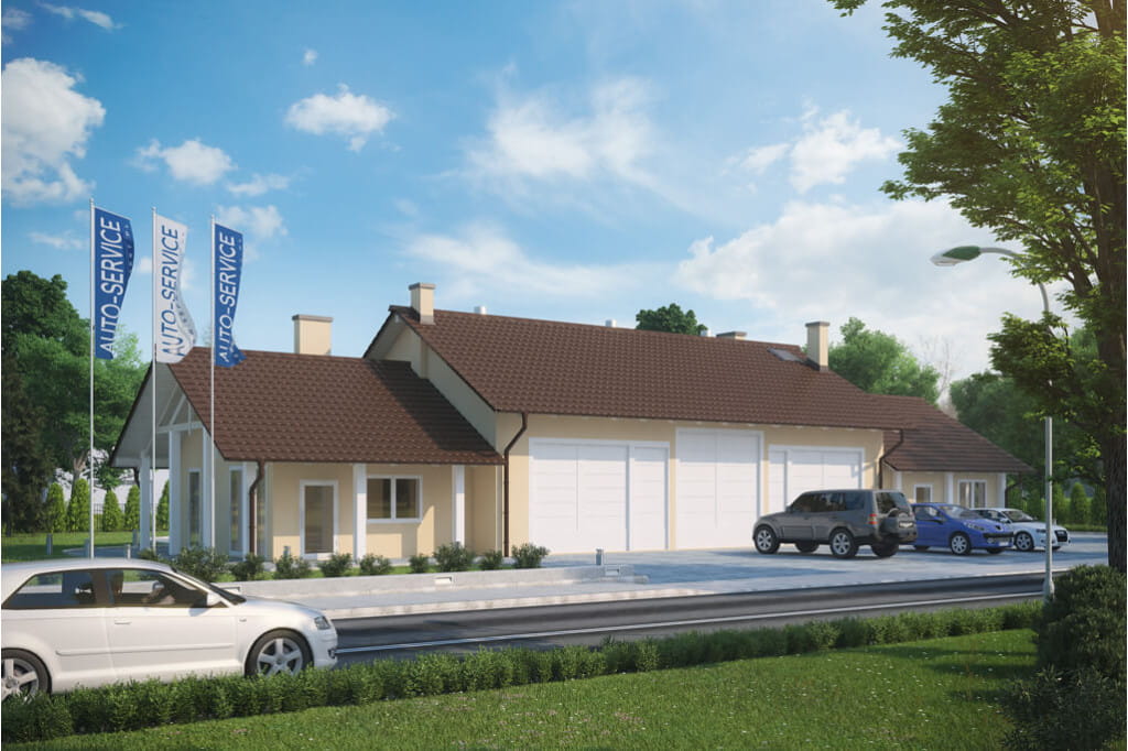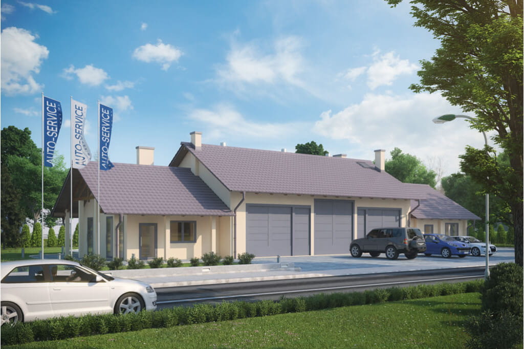 Projekt K-60 to duży warsztat samochodowy przystosowany do obsługi samochodów do 3,5 tony. Utrzymany jest w prostej, eleganckiej stylizacji typowej dla nowoczesnych obiektów komercyjnych. W części centralnej są trzy bramy wjazdowe do sali napraw, a czwarte stanowisko można utworzyć w magazynie, do którego wjazd ulokowaliśmy w elewacji bocznej.