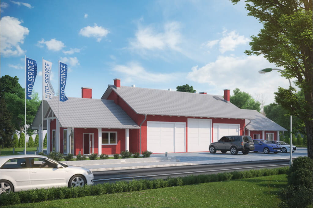 Program: hala napraw dla pojazdów do 3,5 tony, zaplecze socjalne, zaplecze sanitarne, magazyn, biuro, łazienka, WC dla klientów, kotłownia.