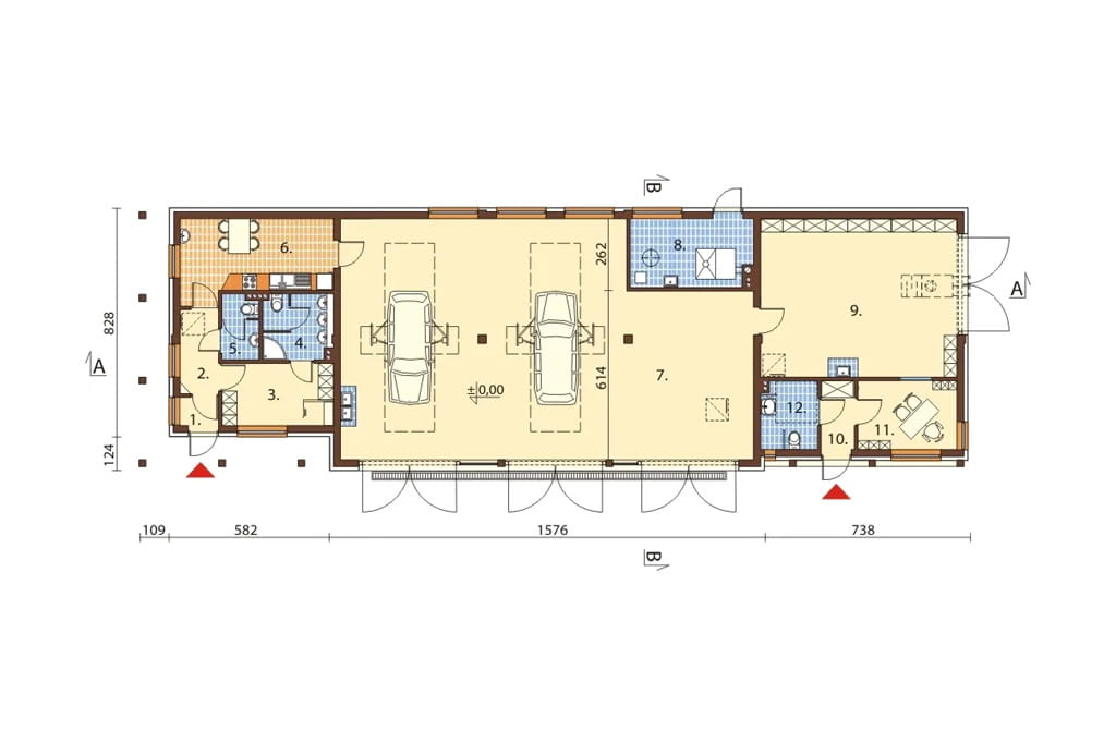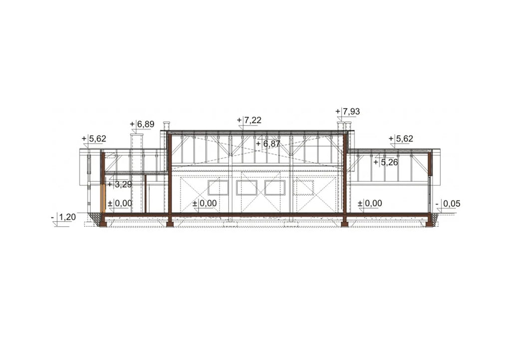 W projekcie przewidzieliśmy dużą salę napraw na trzy samochody o powierzchni 119,07 m2. Ma ona 500 cm wysokości i umożliwia obsługę samochodów do 3,5 tony. Jej część wydzieliliśmy na kotłownię. Z lewej strony budynku jest część socjalna. Pracownicy mogą korzystać z szatni, pokoju socjalnego, łazienki i umywalni. Z prawej strony od sali napraw jest strefa magazynowo biurowa. Składa się na nią strefa obsługi klienta z biurem i WC dla klientów oraz magazyn o powierzchni 41,13m2. Można go z powodzeniem wykorzystać do stworzenie dodatkowego miejsca warsztatowego.