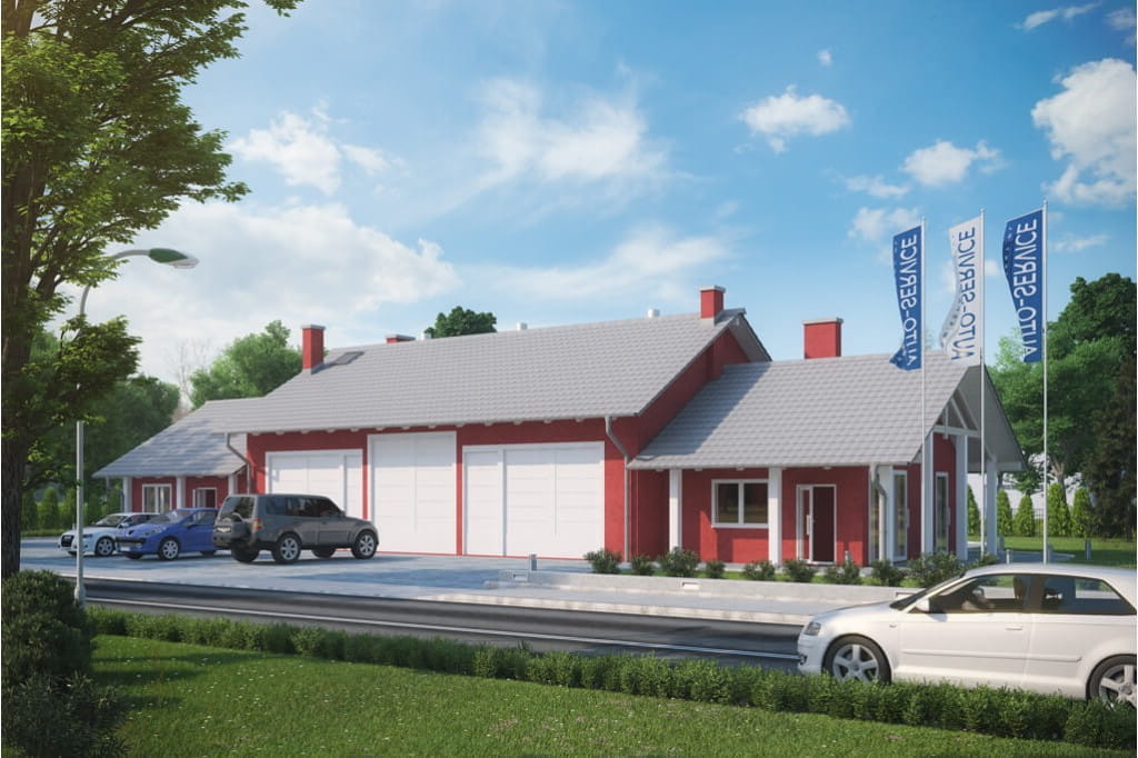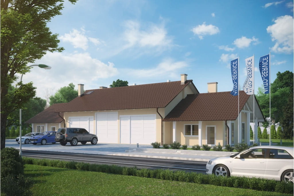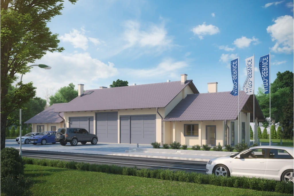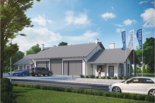 Program: hala napraw dla pojazdów do 3,5 tony, zaplecze socjalne, zaplecze sanitarne, magazyn, biuro, łazienka, WC dla klientów, kotłownia.