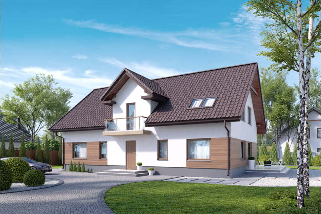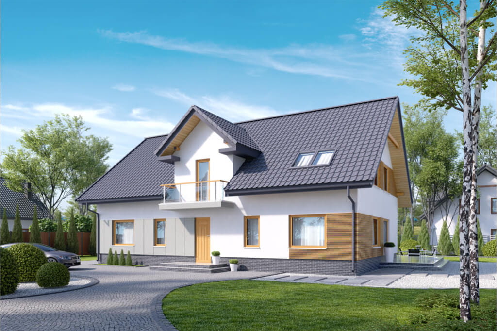 Projekt nowoczesnego domu z poddaszem użytkowym o bogatym programie i dużej powierzchni użytkowej.