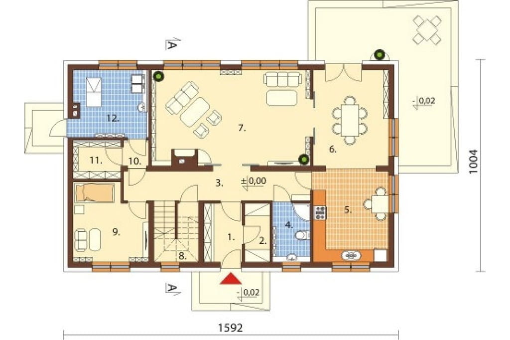 Do domu wchodzimy przez przestronny wiatrołap z garderobą. Idąc w lewo głównym hallem mamy schody na poddasze, mały pokój, spiżarnię i kotłownię na paliwo stałe. Centralną część parteru zajmuje pokój dzienny z kominkiem, a na prawo od niego jest jadalnia i kuchnia. Program uzupełnia znajdująca się obok kuchni łazienka.