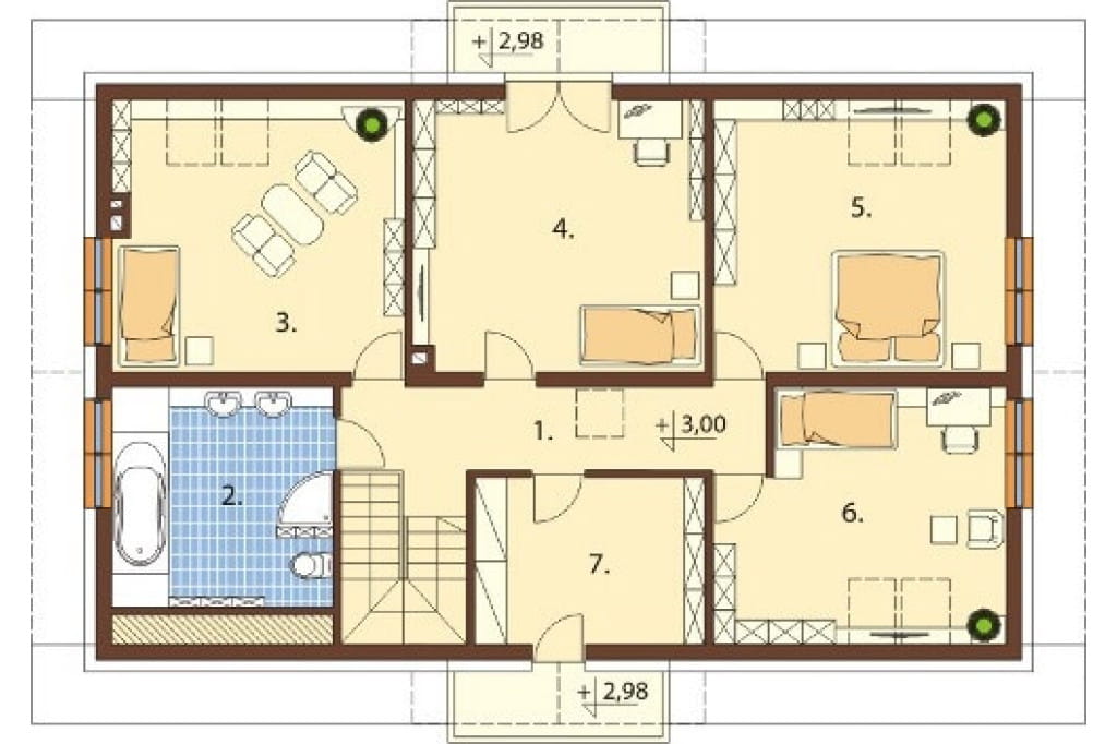 Na poddaszu zaprojektowaliśmy cztery podobnej wielkości sypialnie, oraz dużą wspólną dla poddasze łazienkę. Do adaptacji pozostawiliśmy stryszek z wyjściem na balkon w elewacji frontowej.