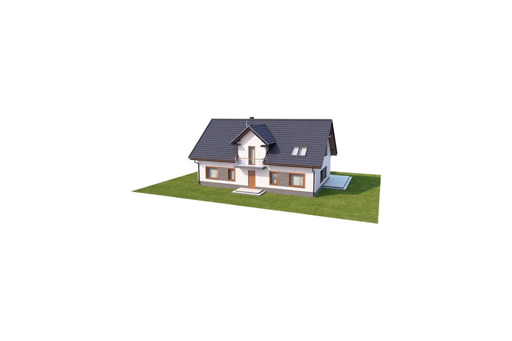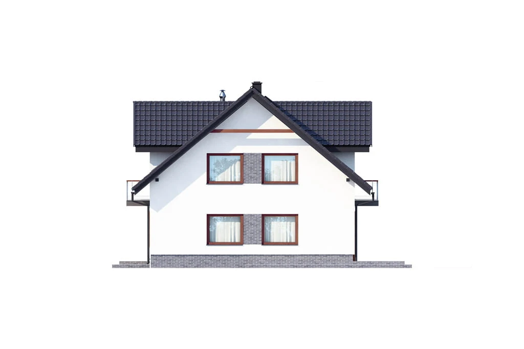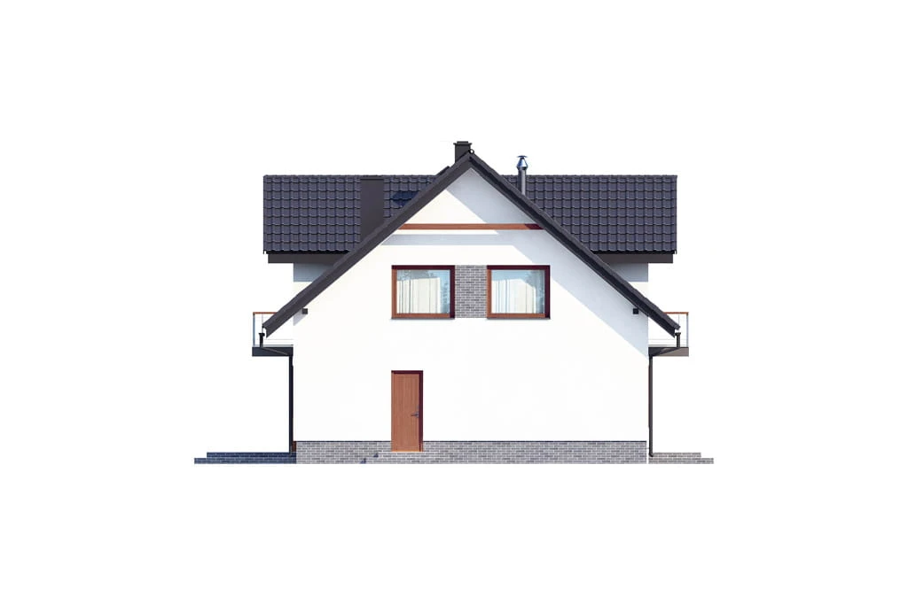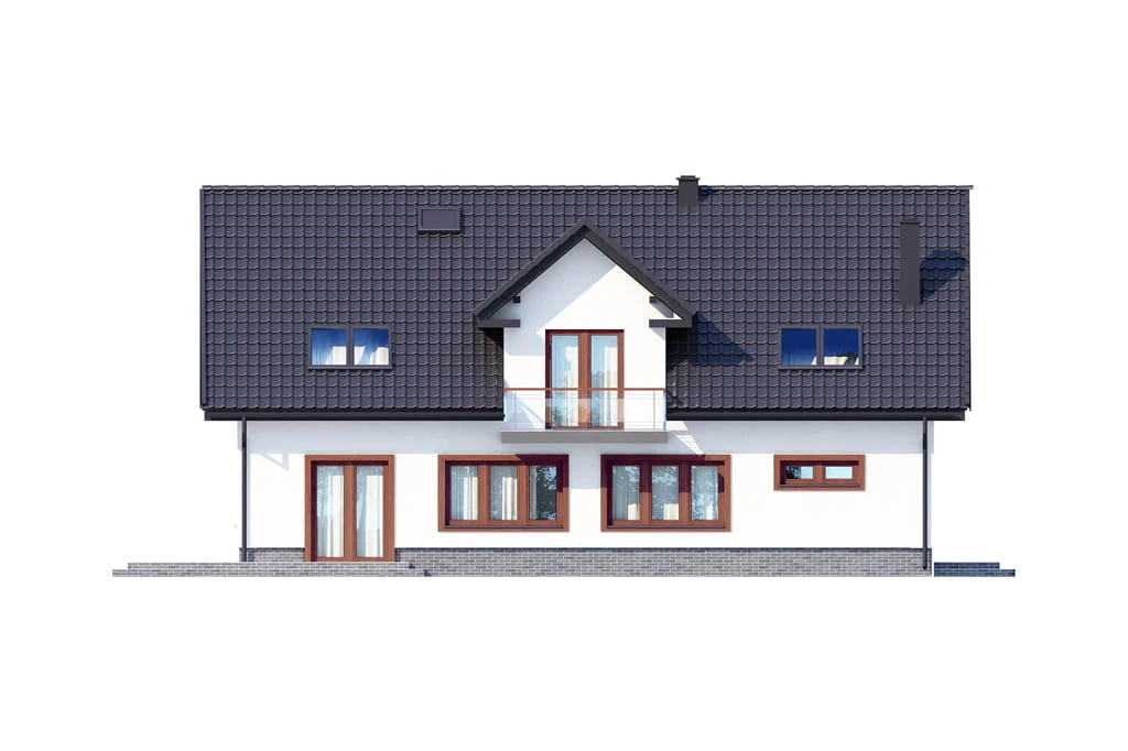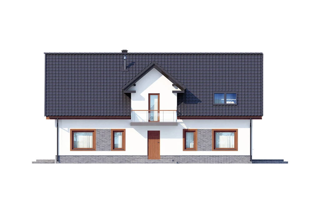 Bryła budynku na bazie prostokąta jest bardzo prosta, co obniża koszty budowy i poprawia energooszczędność. W elewacji frontowej i ogrodowej zaprojektowaliśmy po jednym centralnie umiejscowionym balkonie. Pomieszczenia na poddaszu doświetlane są przez okiennice w elewacji bocznej i okna połaciowe. Do realizacji projektu Makowo potrzebna będzie działka o szerokości 14.39 m.