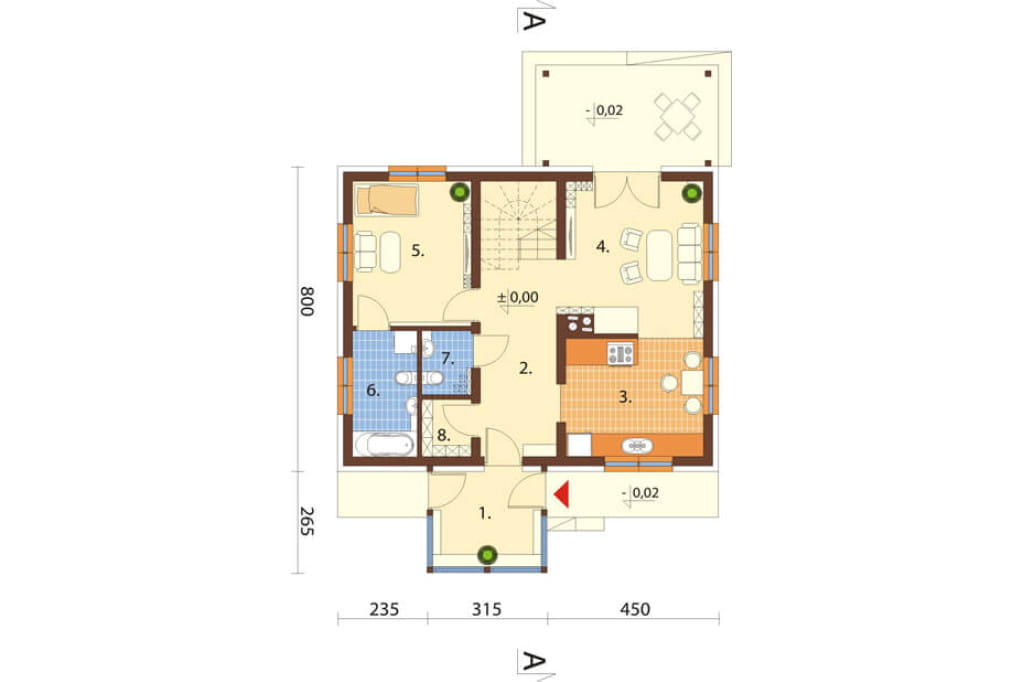 Na parterze stworzyliśmy bardzo praktyczny program. Do domu wchodzi się przez ganek, gdzie można ustawić szafki na obuwie i odzież wierzchnią. Zaraz po wejściu do domu po lewej stronie mamy pomieszczenie gospodarcze oraz WC. Kuchnia jest częściowo otwarta na salon z którego można wyjść na taras z tyłu domu. Obok schodów jest pokój sypialny z własną łazienką, doskonale nadający się na sypialnię dla głowy rodziny.