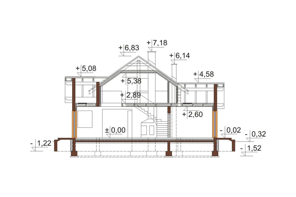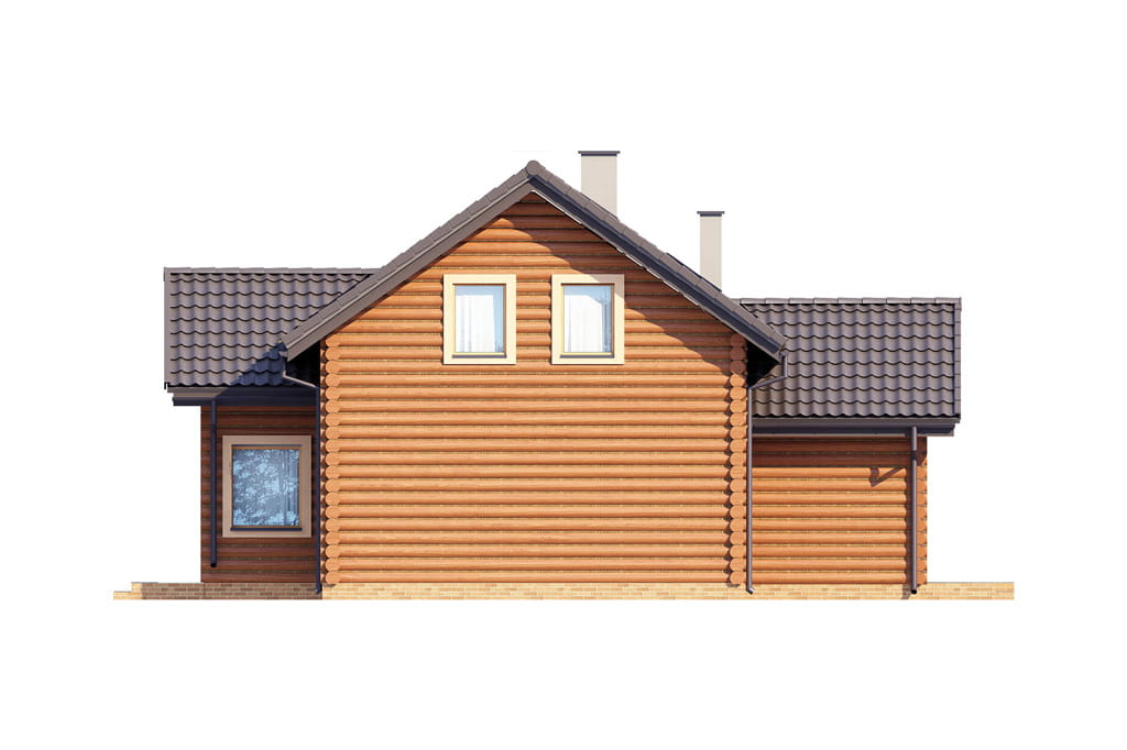Projekt posiada ciekawą bryłę z dwoma wysunięciami, pierwsze jest w części frontowej, a drugie w ogrodowej. Z przodu mamy elegancki ganek z wiatrołapem i kotłownią, a z tyłu budynek ma nieco mniejsze wysunięcie, które powiększa powierzchnię salonu. Dom przykryty jest dwuspadowym dachem o kącie nachylenia dachu równym 35 stopni. Do realizacji projektu potrzebna będzie działka o szerokości minimum 16 m.