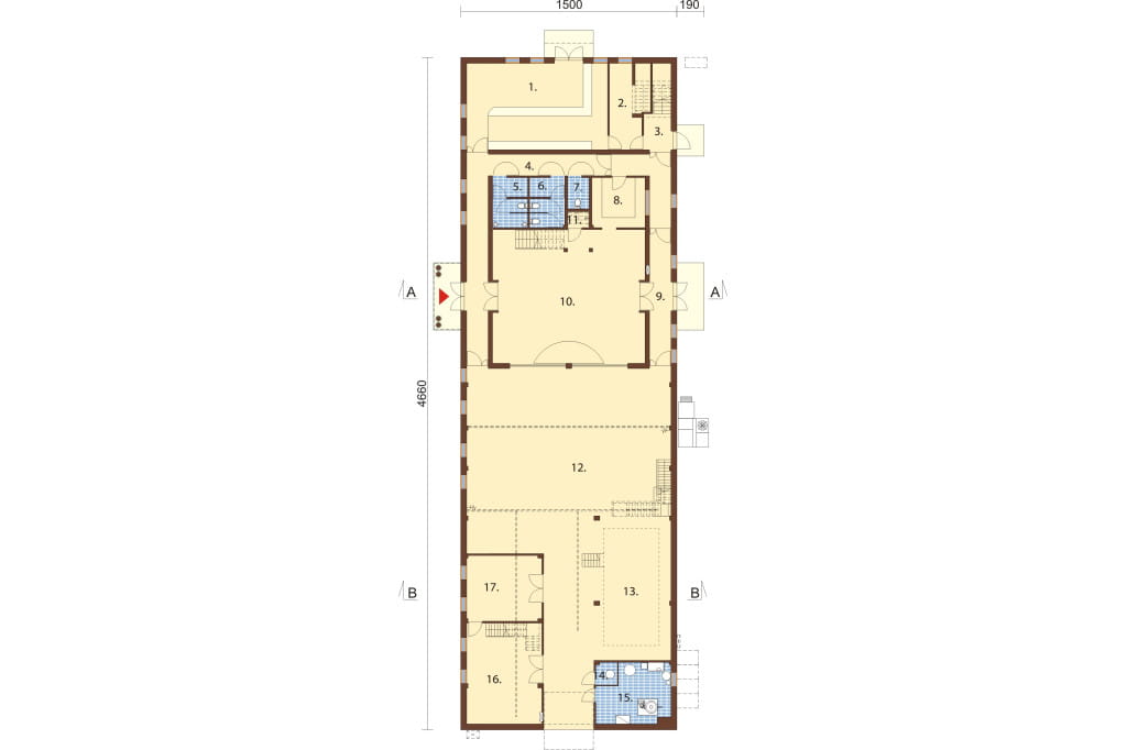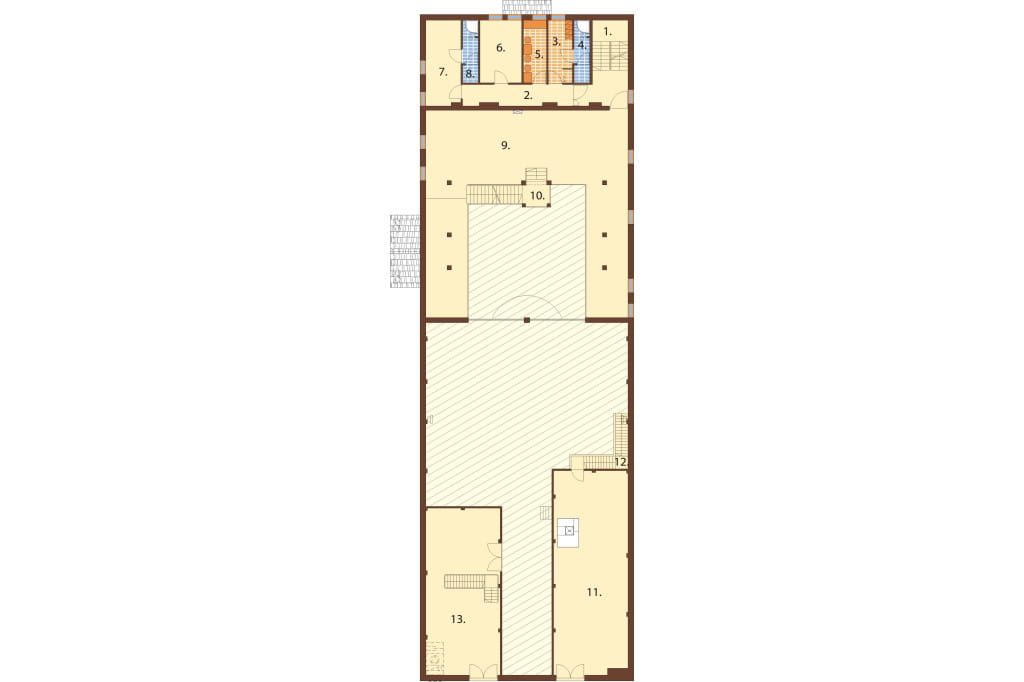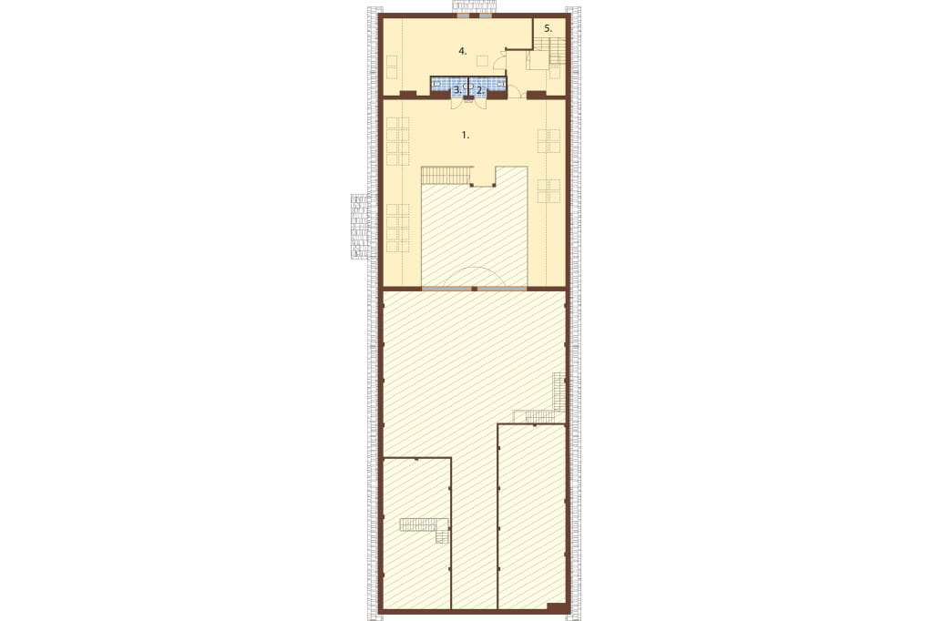 Parter podzielony jest na trzy części. Najwięcej powierzchni użytkowej zajmuje oczywiście hala produkcyjna (browar). Druga pod względem metrażu jest część konferencyjno koncertowa, gdzie mamy sale widowiskową o powierzchni 93,9 m. Trzecią część stanowi część sklepowa, gdzie można prowadzić sprzedaż produktów z browaru.