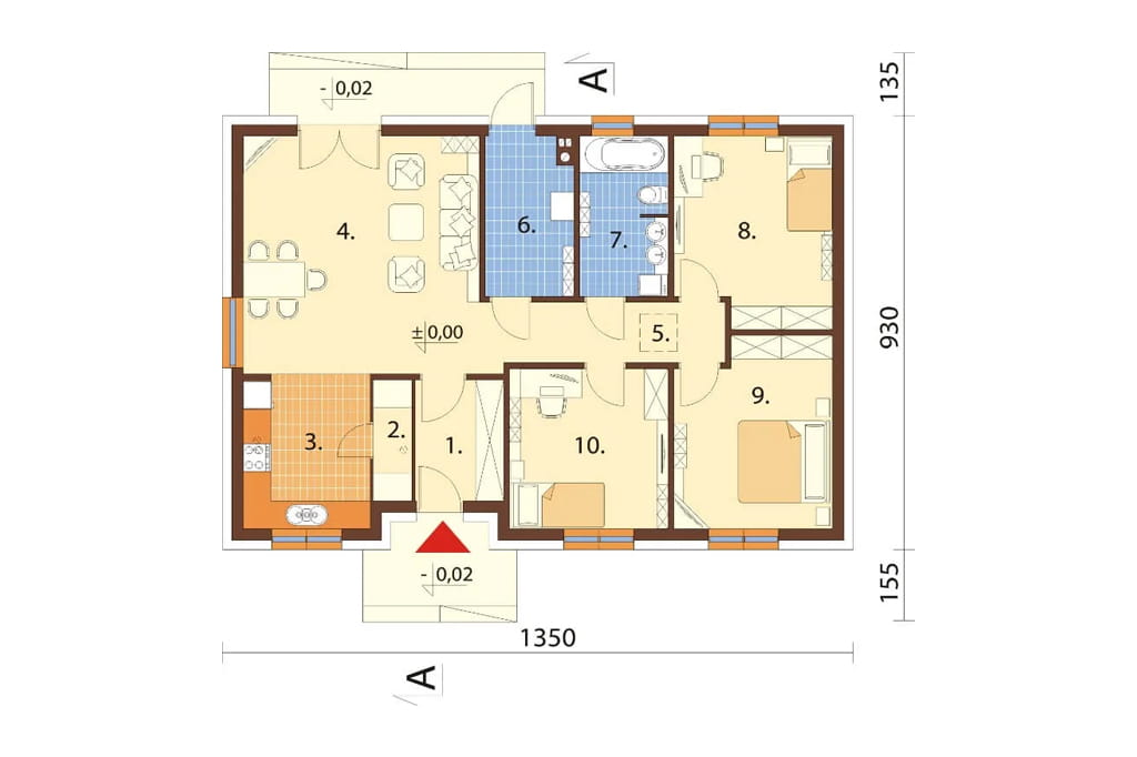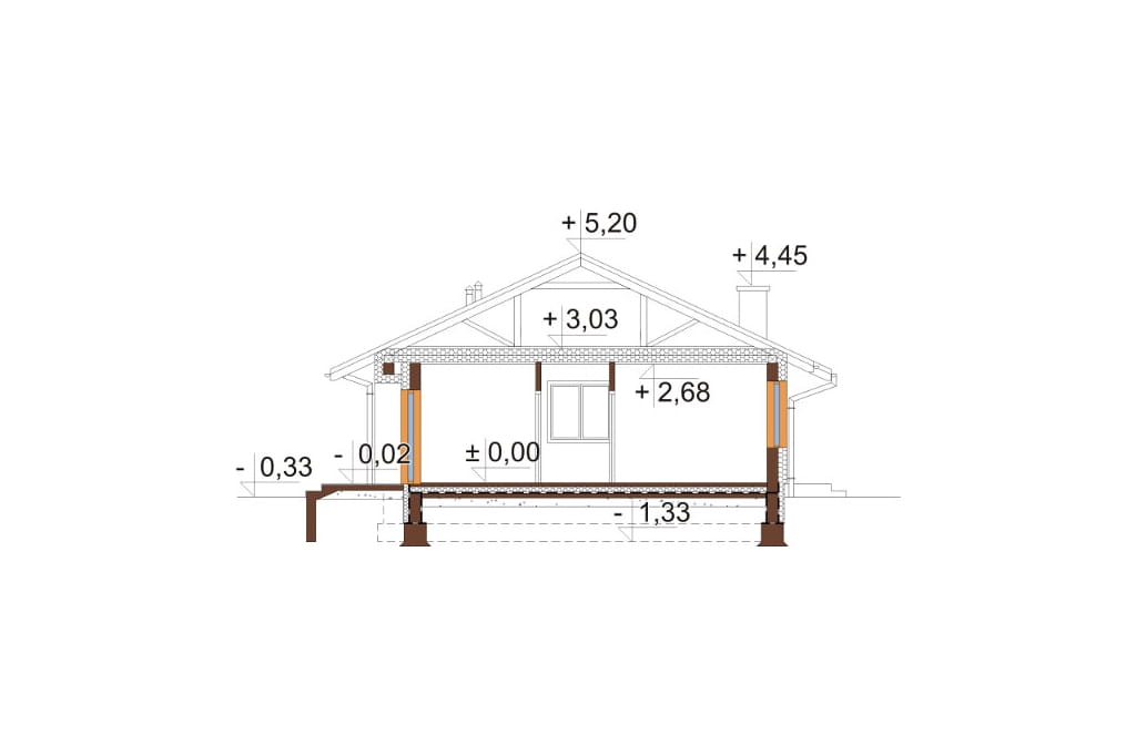 Program: wiatrołap, spiżarnia, kuchnia, salon z jadalnią, 3 pokoje, łazienka, kotłownia.