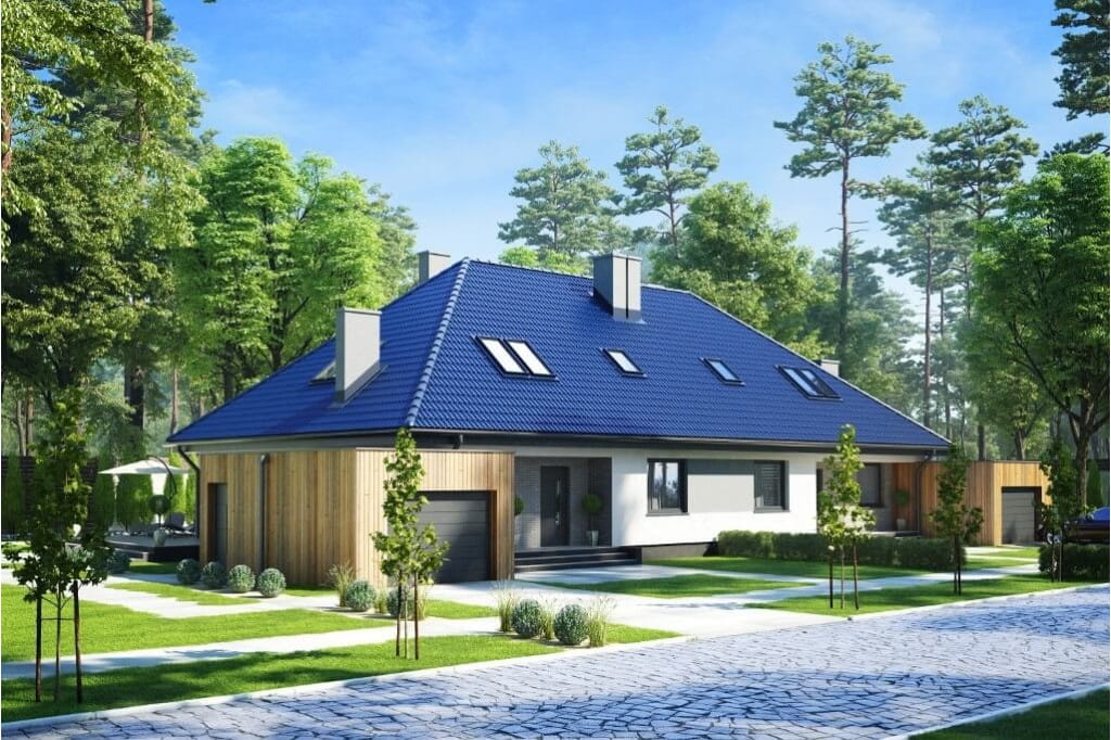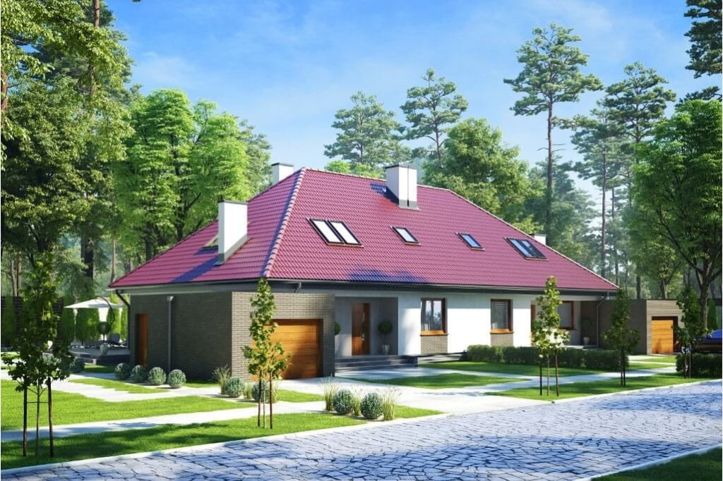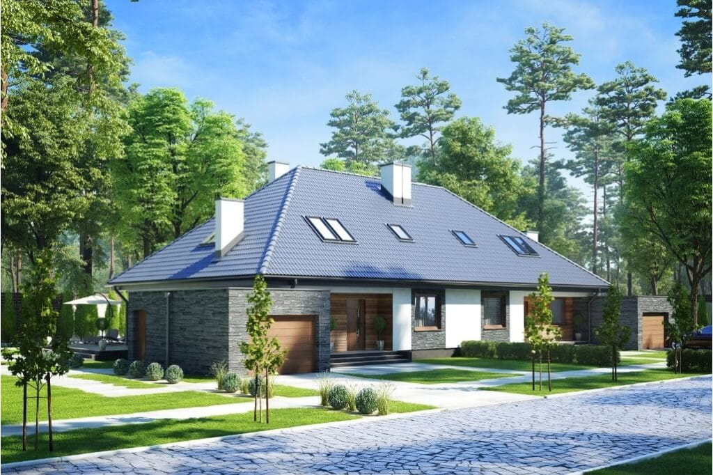Dom dwurodzinny w zabudowie bliźniaczej. Parterowy z poddaszem użytkowym , bez podpiwniczenia, z garażem.