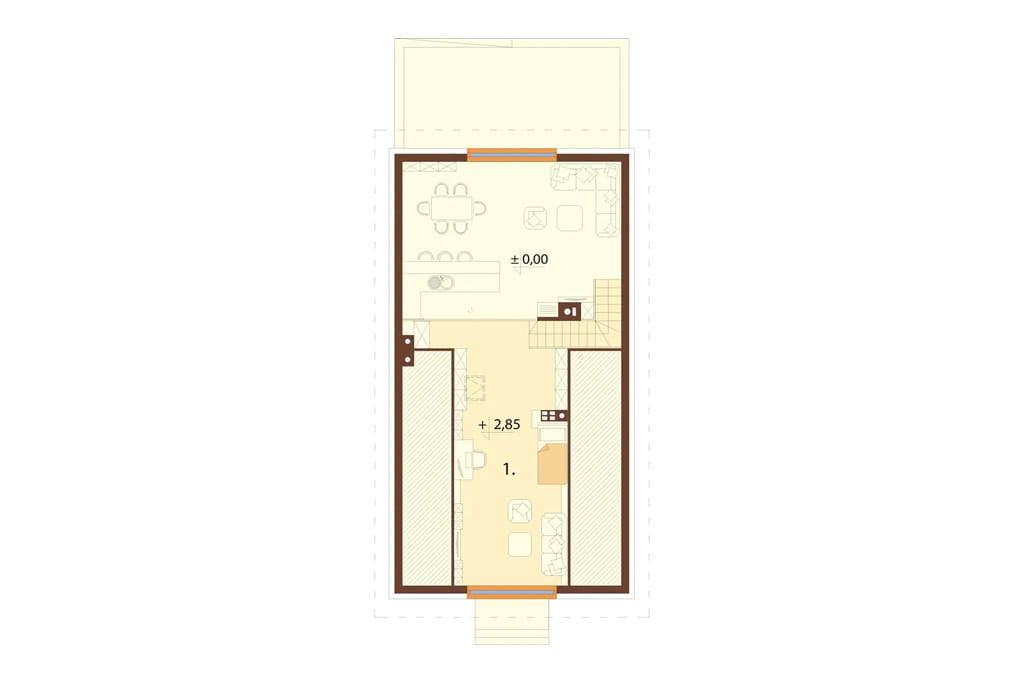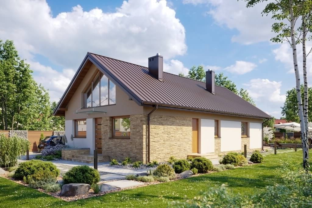 Złotlinek B to projekt domu parterowego z antresolą, który można budować na wąskich działkach.