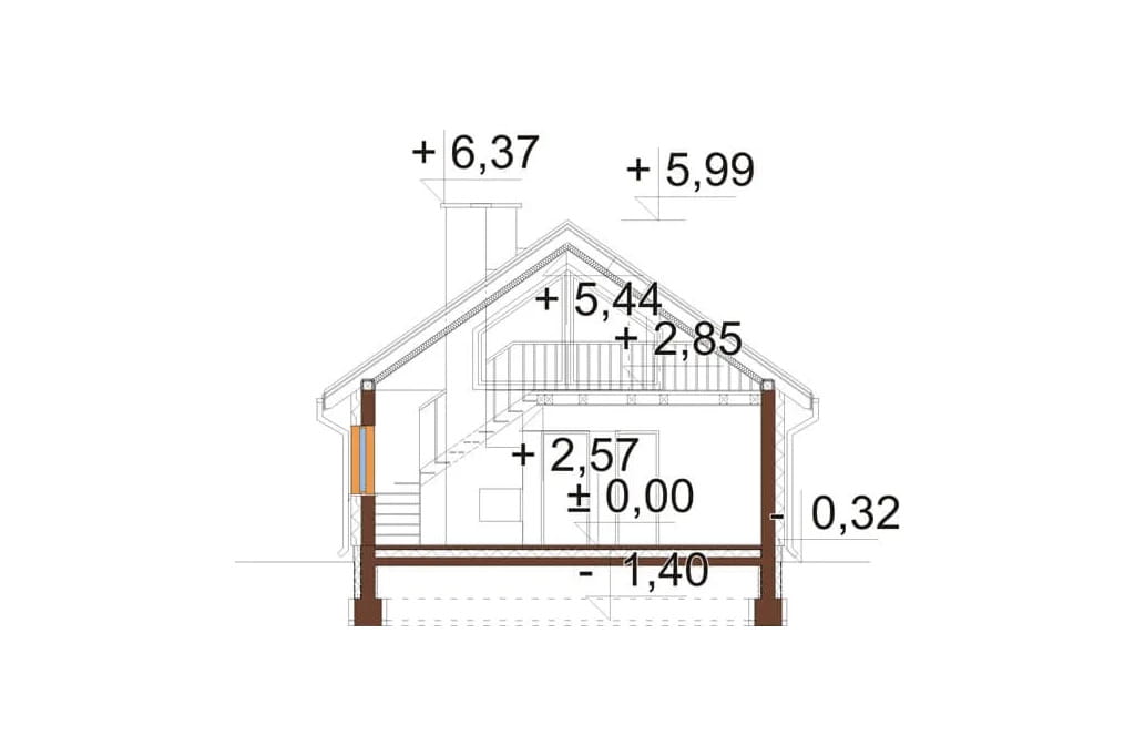 Złotlinek B ma wysmukłą bryłę, dlatego można go budować na wąskich działkach. Ponadto jedna z elewacji bocznych nie ma okien co sprawia, że będziemy mogli się zbliżyć do granicy działki. Projekt ten ma dwuspadowy dach o kącie nachylenia równym 35 stopni, z kalenicą prostopadłą do drogi. Wielkim atutem Złotlinka B są także niskie koszty budowy wynikające z prostoty zastosowanych rozwiązań konstrukcyjnych i architektonicznych.