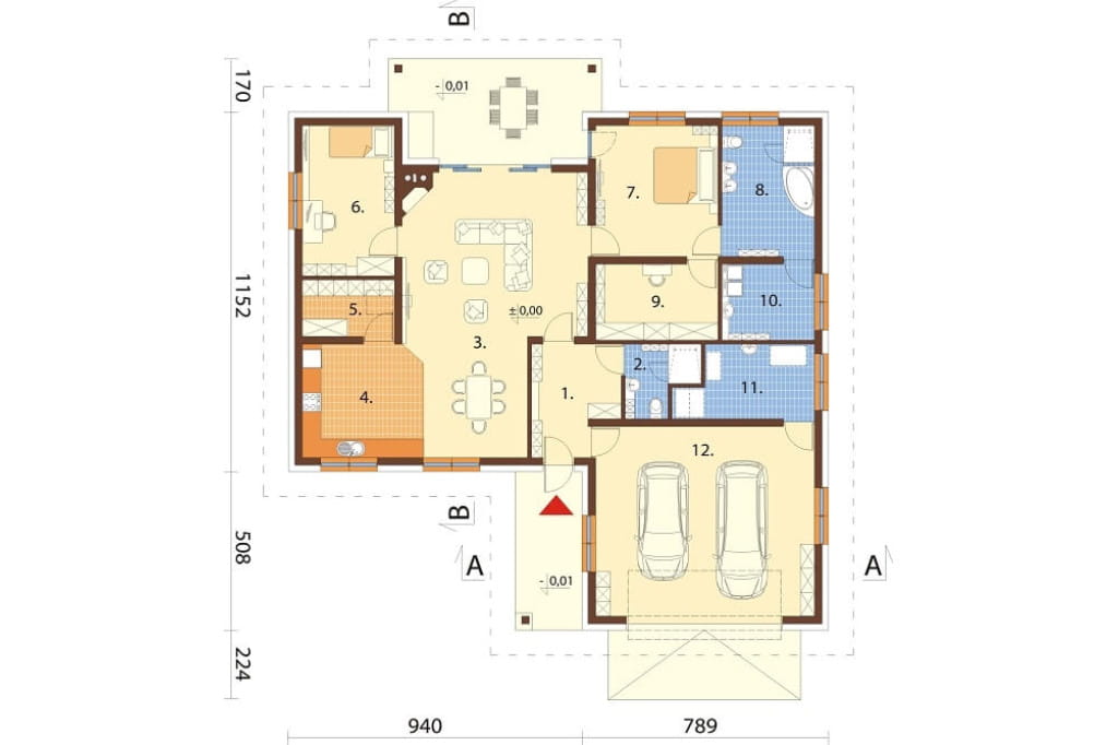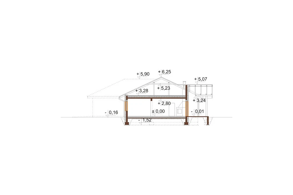 Rozłożysta bryła doskonale prezentowała się będzie na dużych działkach z zielenią. Do realizacji projektu potrzebna będzie parcela o szerokości min. 25.29 m. Cechą charakterystyczną domu jest wysunięty z elewacji frontowej garaż dwustanowiskowy. Od strony elewacji ogrodowej zaprojektowaliśmy natomiast mały taras, na który można wyjść przez salon.