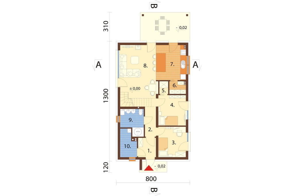 Ośnieża 2 ma rozbudowany plan parteru. Do domu wchodzimy przez wiatrołap, z którego można przejść do kotłowni. Dalej idąc korytarzem mamy mały pokój, łazienkę, drugi pokój z garderobą i wyjściem na zewnątrz. Na końcu korytarza są schody na poddasze. Strefę dzienną tworzy widny salon oraz jadalnia i kuchnia (ze spiżarnią).