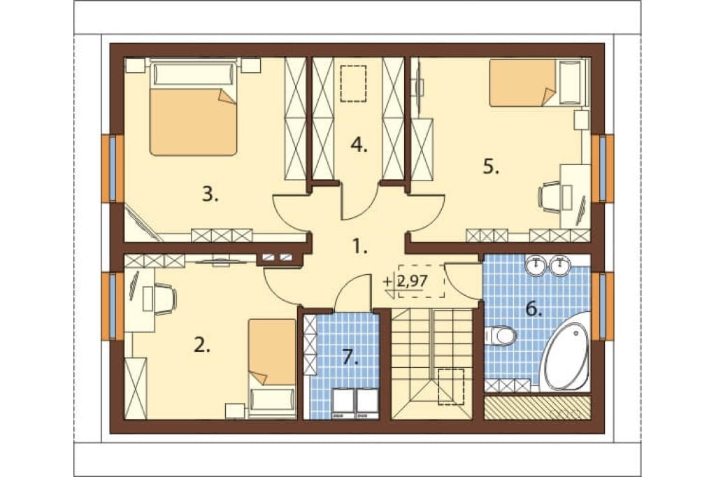 Na poddaszu są trzy pokoje, pomiędzy pokojami 3 i 5 ulokowana jest mała garderoba, z której korzystać mogą wszyscy domownicy. Przy schodach na parter jest pralnia i łazienka.