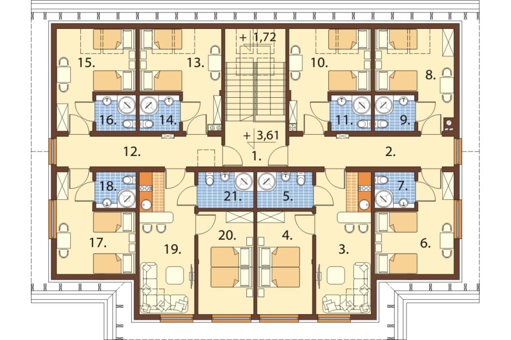 Poddasze: 10 pokoi w tym 2 z aneksem kuchennym, 8 łazienek.