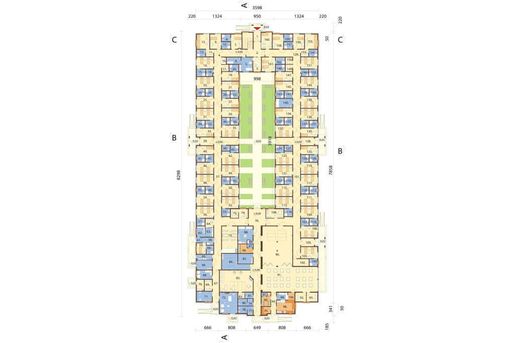 Parter: wiatrołap, hall z klatką schodową , recepcja, gabinet diagnostyczno zabiegowy, z łazienką, dyżurka lekarska z łazienką, szafa gospodarcza, 2 brodowniki, pomieszczenie na bieliznę czystą, pomieszczenie na bieliznę brudną, 2 WC ogólnodostępne, izolatka z łazienką, śluza umywalkowa fartuchowa, dział farmacji, punkt przygotowania leków, punkt wydawania leków, pomieszczenie na odpadki medyczne, postmorte, pralnia podręczna, pomieszczenie gospodarcze, rozdzielnia elektryczna, hydrofornia, kotłownia, kaplica, dyżurka pielęgniarek, WC damskie z przedsionkiem umywalkowym, WC męskie z przedsionkiem umywalkowym, pomieszczenie rehabilitacyjne, pomieszczenie na zabiegi krioterapii, pomieszczenie na zabiegi elektromagnetyczne, gabinet zabiegowy, świetlica, jadalnia, magazyn zasobów, punk przyjęcia kateringu, pomieszczenie socjalne dla pracowników kuchni z WC, kuchnia, zmywalnia, wydawalnia, 14 pokoi 1 osobowych z łazienkami, 20 pokoi 2 osobowych z łazienkami.