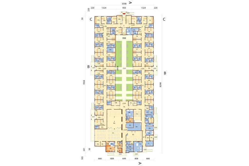 Parter: wiatrołap, hall z klatką schodową , recepcja, gabinet diagnostyczno zabiegowy, z łazienką, dyżurka lekarska z łazienką, szafa gospodarcza, 2 brodowniki, pomieszczenie na bieliznę czystą, pomieszczenie na bieliznę brudną, 2 WC ogólnodostępne, izolatka z łazienką, śluza umywalkowa fartuchowa, dział farmacji, punkt przygotowania leków, punkt wydawania leków, pomieszczenie na odpadki medyczne, postmorte, pralnia podręczna, pomieszczenie gospodarcze, rozdzielnia elektryczna, hydrofornia, kotłownia, kaplica, dyżurka pielęgniarek, WC damskie z przedsionkiem umywalkowym, WC męskie z przedsionkiem umywalkowym, pomieszczenie rehabilitacyjne, pomieszczenie na zabiegi krioterapii, pomieszczenie na zabiegi elektromagnetyczne, gabinet zabiegowy, świetlica, jadalnia, magazyn zasobów, punk przyjęcia kateringu, pomieszczenie socjalne dla pracowników kuchni z WC, kuchnia, zmywalnia, wydawalnia, 14 pokoi 1 osobowych z łazienkami, 20 pokoi 2 osobowych z łazienkami.