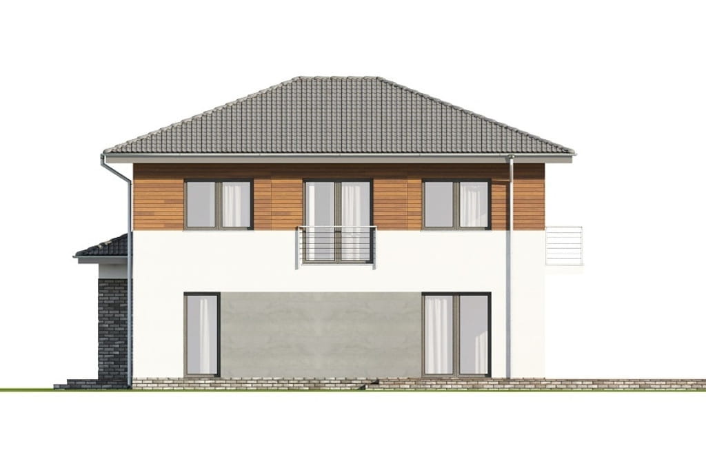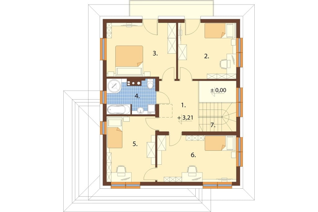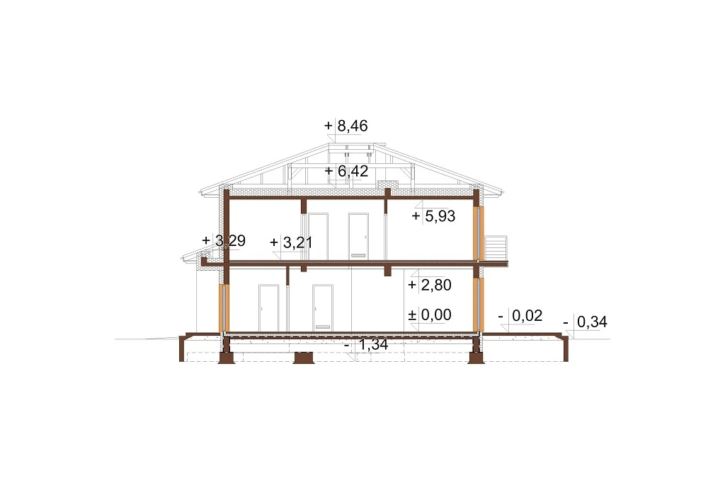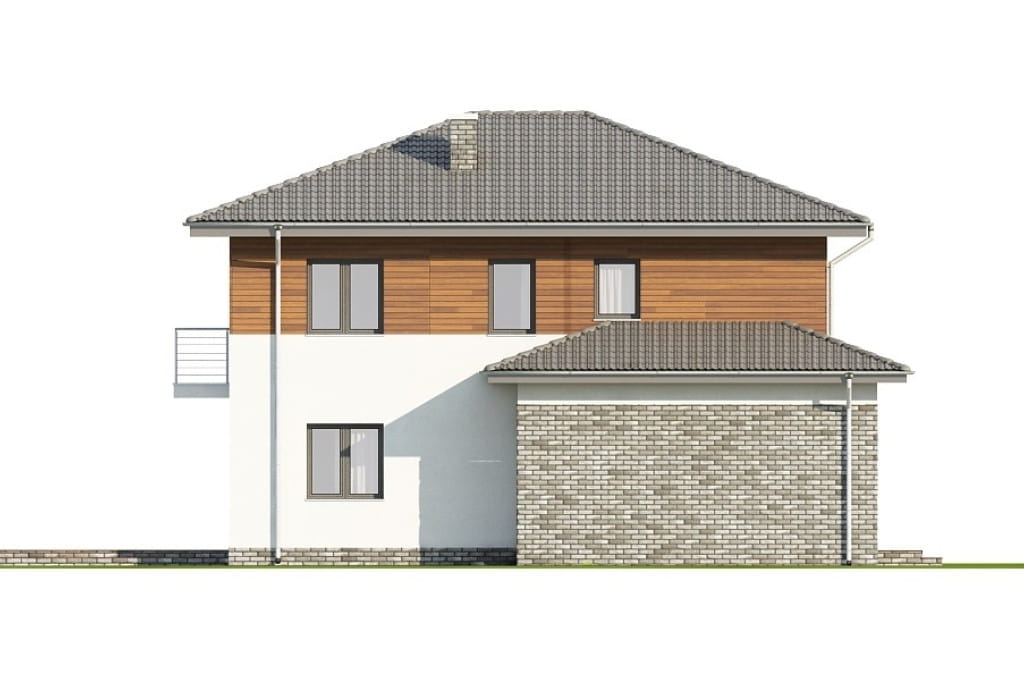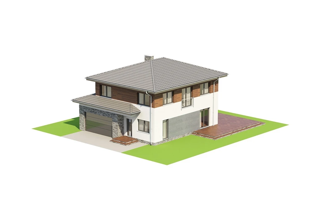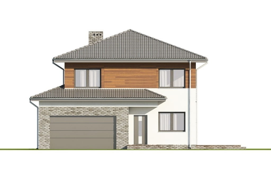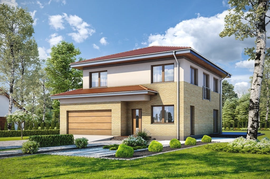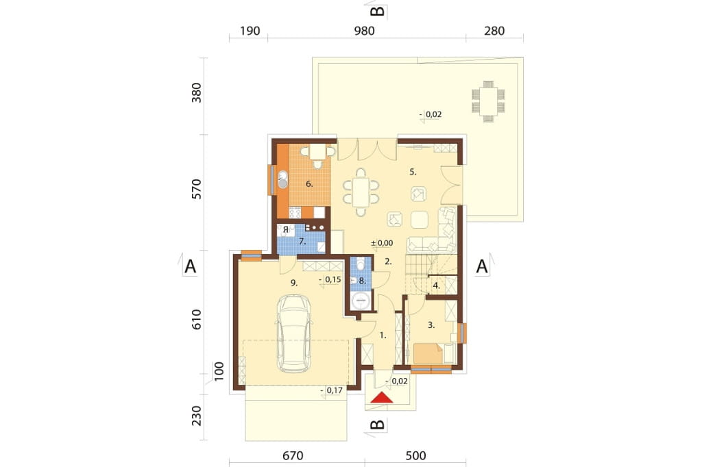 Program: wiatrołap, hol, 5 pokoi, schowek, salon z jadalnią, kuchnia, kotłownia, WC, garaż, łazienka.