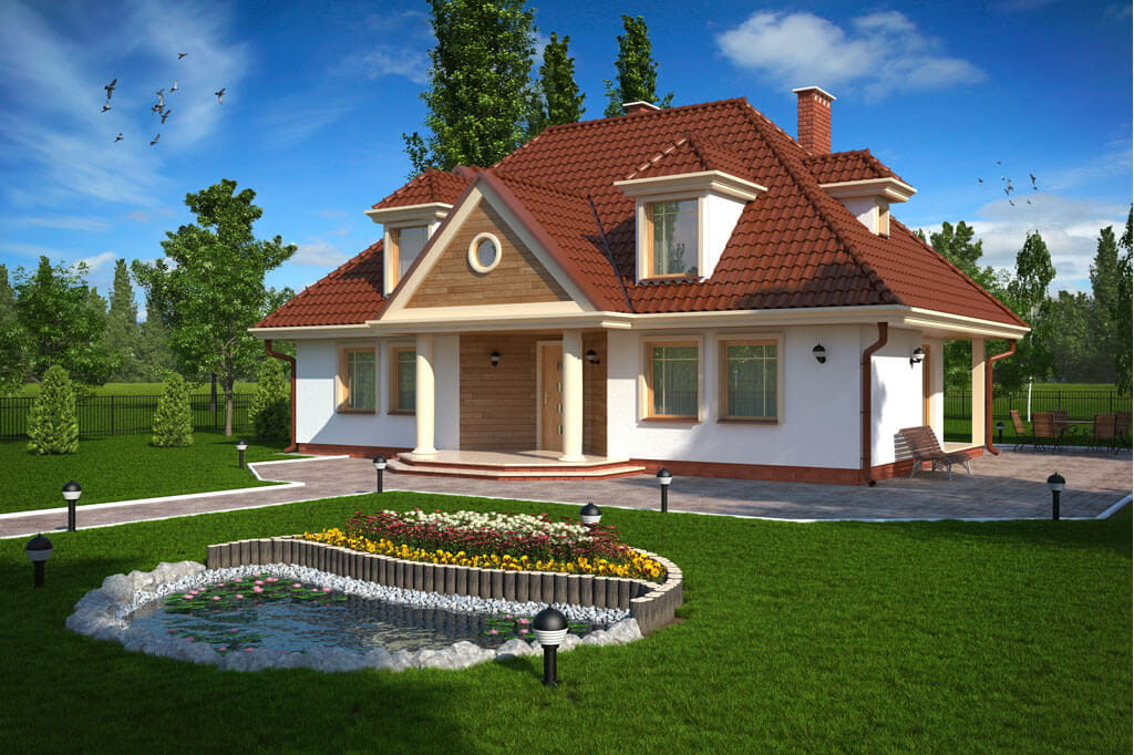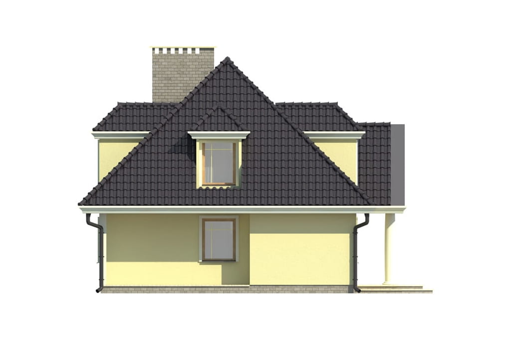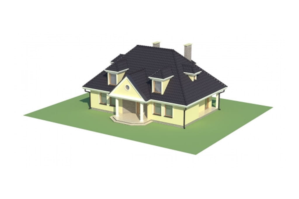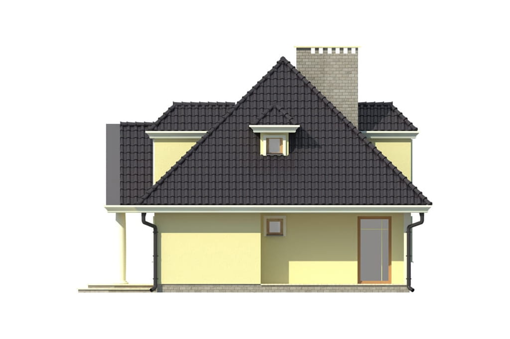 Bryła obiektu zaplanowana została w sposób symetryczny względem osi wejścia, co niewątpliwie poprawia odbiór wizualny całego budynku. Na pierwszy rzut oka uwagę zwracają nowoczesne lukarny i reprezentacyjne wejście z dwoma kolumnami niosącymi konstrukcję i ciekawie ukształtowanymi schodami. Wejście jest zadaszone, co doskonale chroni je przed deszczem lub śniegiem i poprawia komfort życia. Kopertowy dach jest idealnym rozwiązaniem dla osób niekoniecznie chcących budować dom ze zwykłą połacią dwuspadową.
