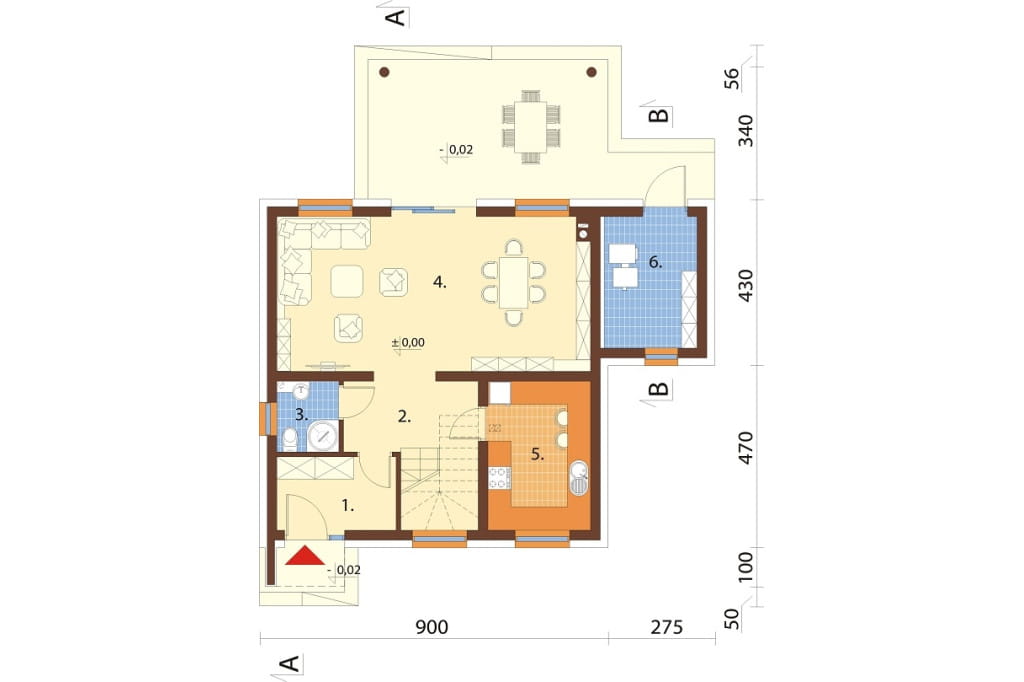 Program: wiatrołap, hol, 2 łazienki, salon z jadalnią, kuchnia, kotłownia, 3 pokoje