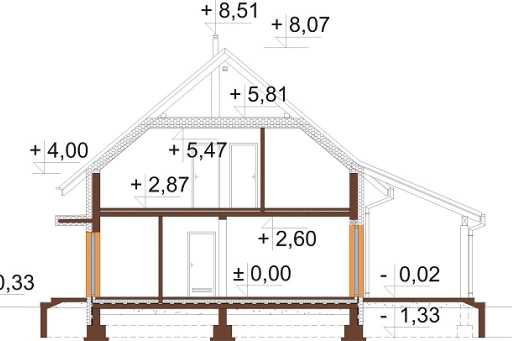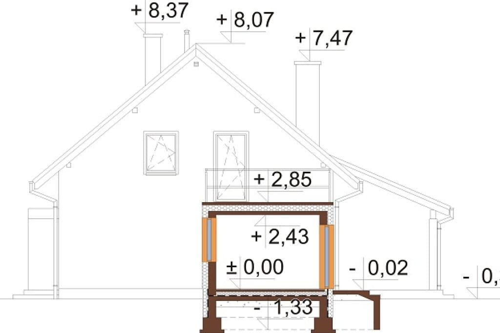 Budynek parterowy z poddaszem użytkowym, niepodpiwniczony i bez garażu.
