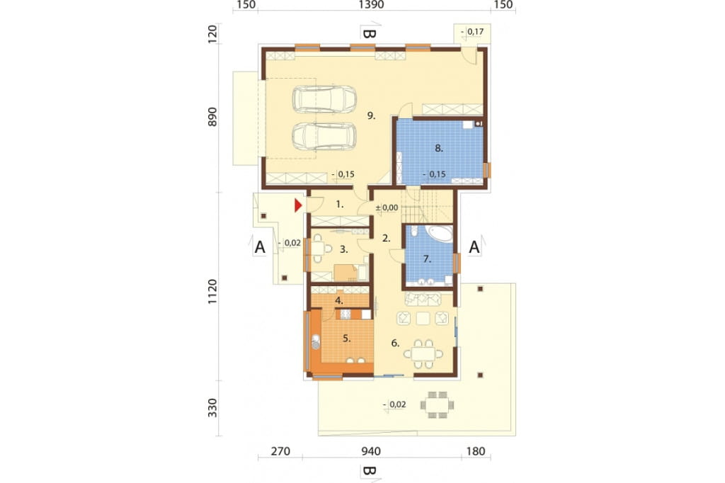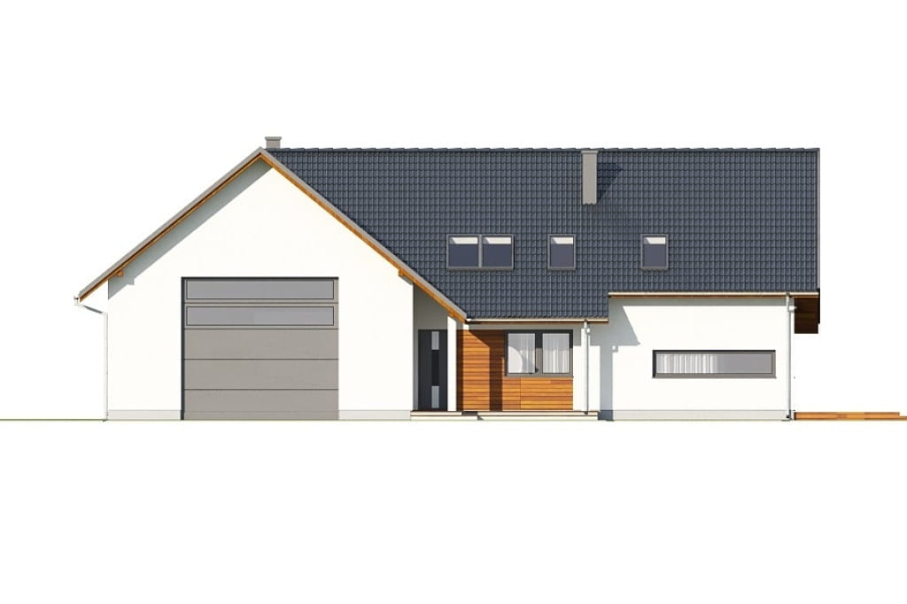 Program: wiatrołap, hol, 4 pokoje, spiżarnia, kuchnia, salon z jadalnią, 2 łazienki, kotłownia, garaż dwustanowiskowy, pralnia, garderoba.