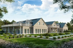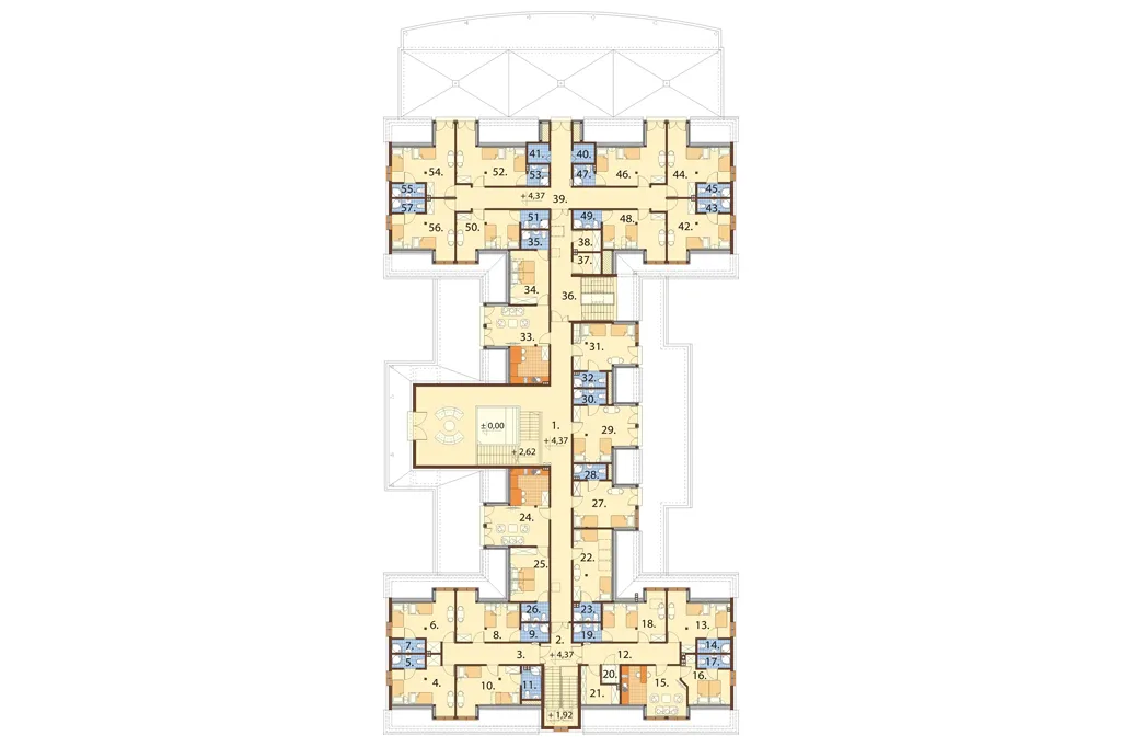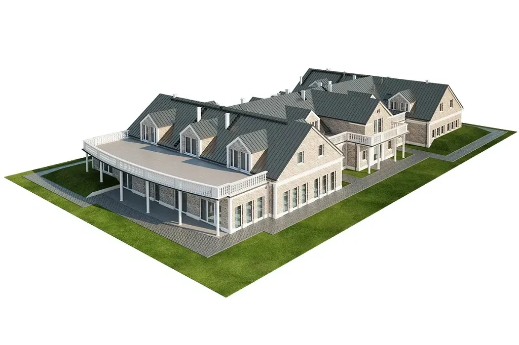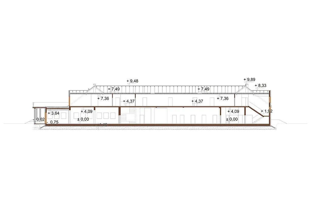 Program: wiatrołap, recepcja, szatnia, WC męskie, WC damskie, WC dla osób niepełnosprawnych, kotłownia, kuchnia, bar, sala wielofunkcyjna duża, sala wielofunkcyjna mała, 18 pokoi dwuosobowych z łazienką, 3 pokoje dwuosobowe z łazienką i aneksem kuchennym, pomieszczenia techniczne, gospodarcze i magazynowe
