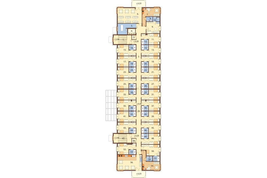 Piętro: szafa z bielizną brudną, łazienka do mycia osób niepełnosprawnych, pokój socjalny personelu pomocniczego, dyżurka pielęgniarska, 20 pokoi dwuosobowych z łazienkami, pokój socjalny personelu medycznego.