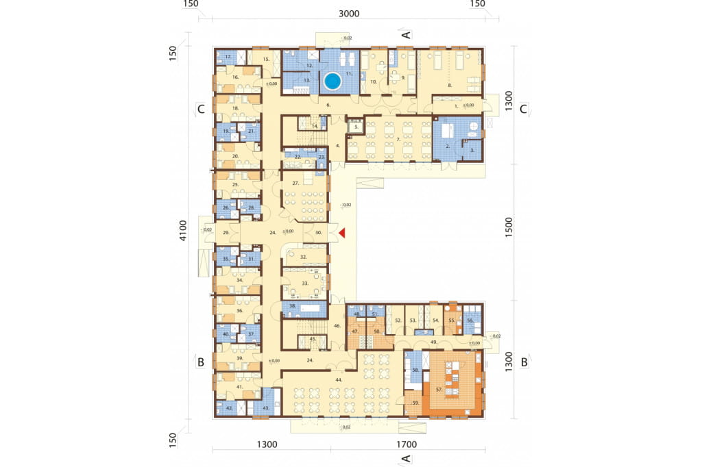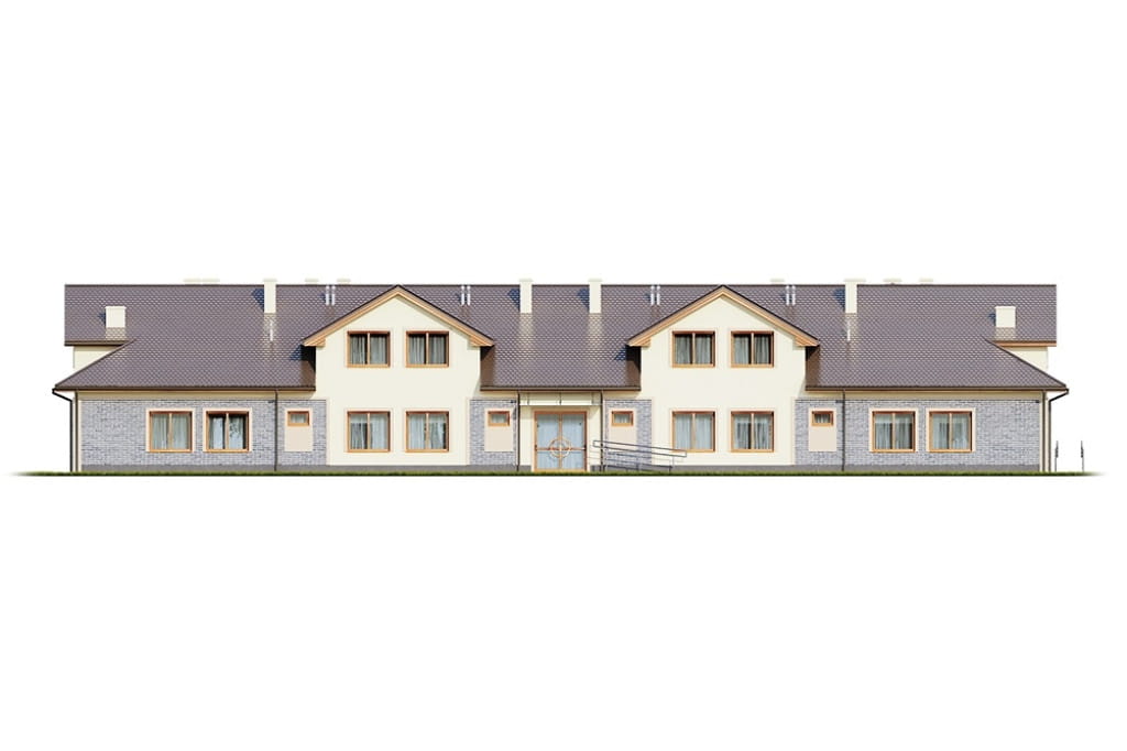 Parter: pomieszczenie techniczne, kotłownia, skład opału, klatka schodowa, szyb windy, pokój pobytu dziennego, rehabilitacji, gabinet zabiegowy, gabinet lekarski, pomieszczenie rekreacyjne – jacuzzi, WC z natryskiem, szatnia, pomieszczenia porządkowe, pomieszczenie na bieliznę czystą i brudną, kaplica, WC damskie, WC męskie, dyżurka pielęgniarska z WC, recepcja, biuro, pralnia, jadalnia, pomieszczenie na środki czystości, pomieszczenie socjalne personelu pomocniczego, pomieszczenie socjalne personelu kuchni, 8 pokoi 2‑osobowych z łazienką, 3 magazyny, pomieszczenie chodziarek, obróbka warzyw i jarzyn, zmywalnia, rozdzielnia kelnerska.