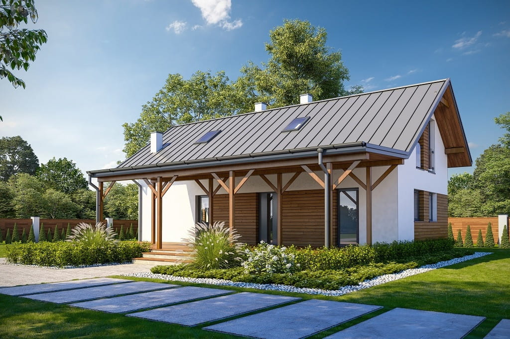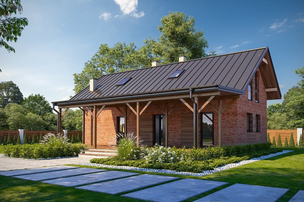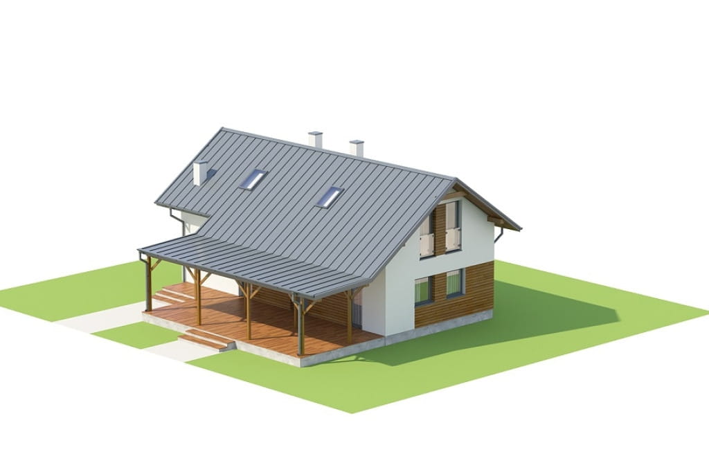 Projekt domu parterowego z poddaszem użytkowym, jednorodzinnego, tradycyjnego, bez garażu, z dachem dwuspadowym, z kątem nachylenia do 35°, technologia murowana lub szkieletowa, z kominkiem, z dodatkowym pokojem senioratką na parterze, energooszczędny, do 120 m2, do 200 tys. zł.
