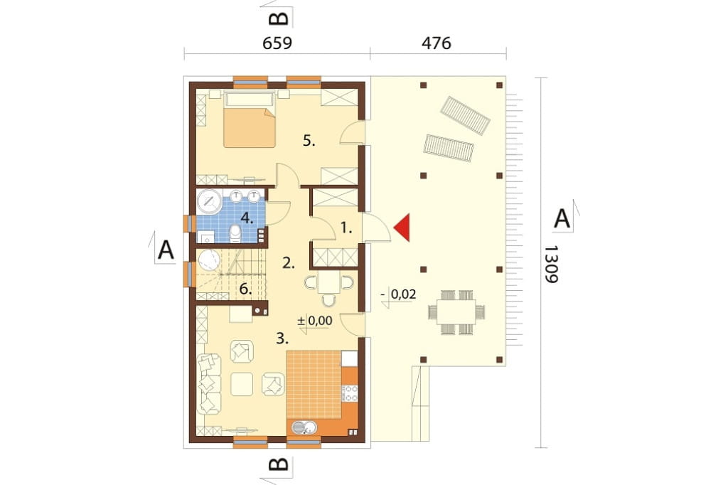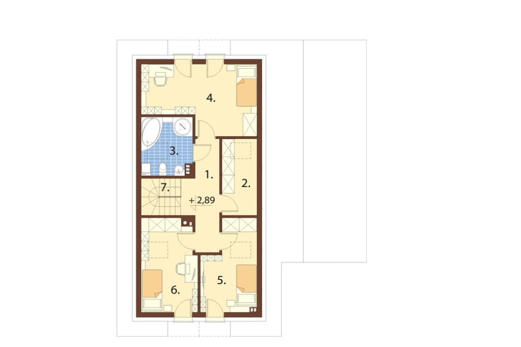 Program: wiatrołap, salon z aneksem kuchennym, 2 łazienki, 4 pokoje, pomieszczenie gospodarcze, garderoba.
