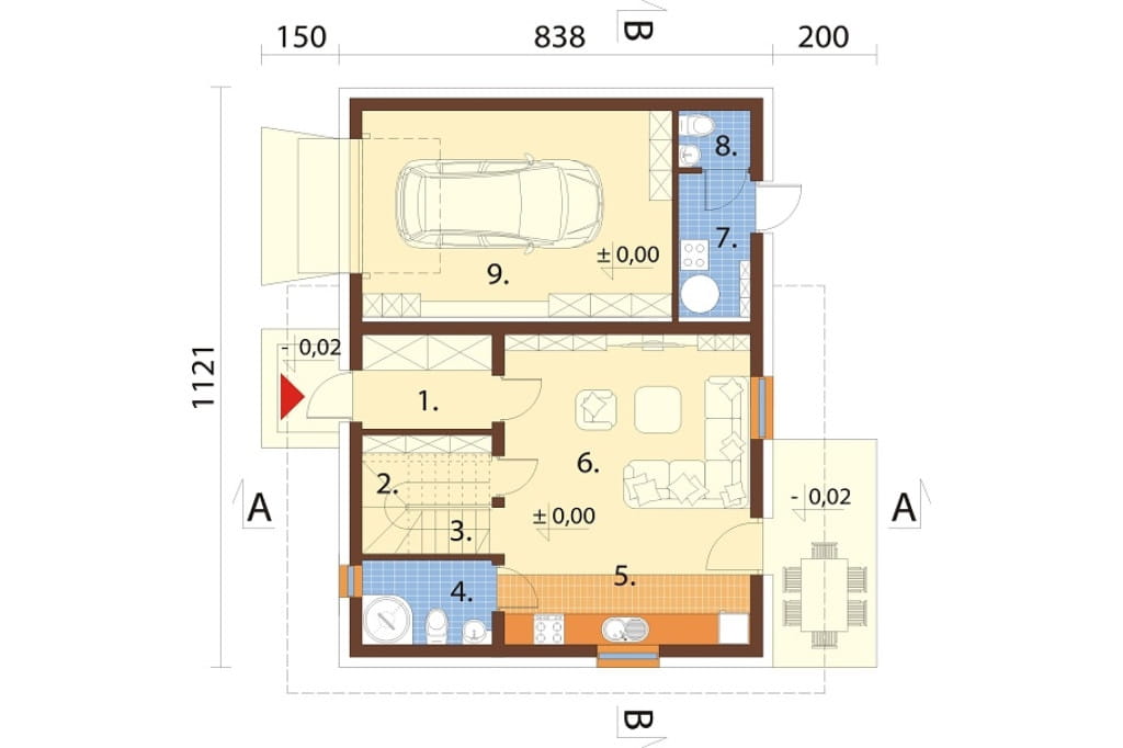 Program: wiatrołap, składzik, komunikacja, kuchnia z jadalnią, salon, pomieszczenie gospodarcze, WC, garaż jednostanowiskowy, 3 pokoje, łazienka.