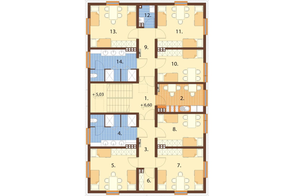 Parter: wiatrołap, klatka schodowa, korytarz, kuchnia z jadalnią, 2 łazienki, kotłownia, pomieszczenie techniczne, 2 pokoje 4 osobowe, 3 pokoje 5 osobowe